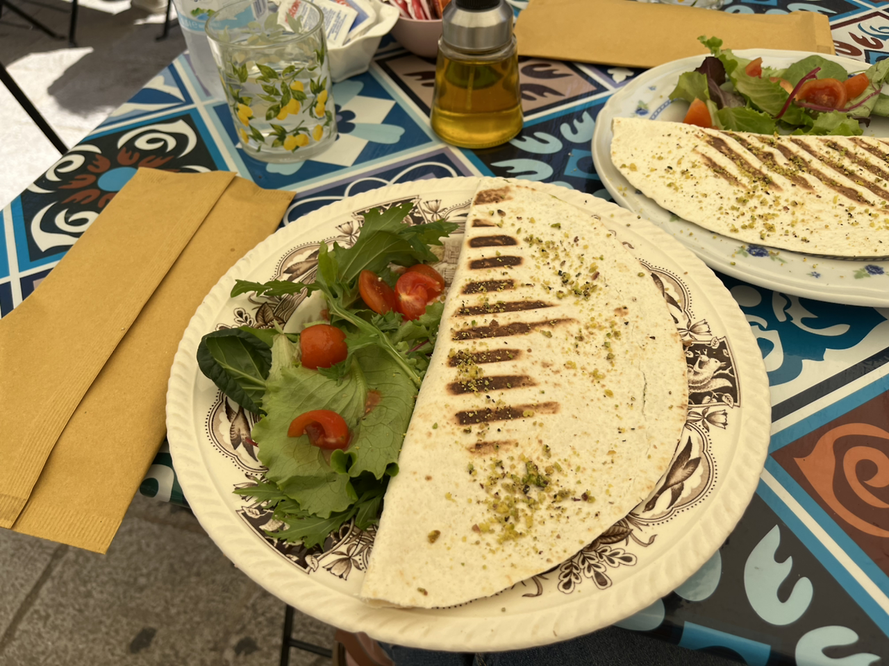 앉아서 책을 읽다가, 배가 고파져서 식사 메뉴를 구경했다. 피아디나 Piandina라는 이탈리아식 샌드위치 메뉴가 신기해 보여서 주문해봤다. 또르띠아같은 플랫 브레드에 페스토와 치즈와 토마토, 바질, 넛츠를 넣어 반으로 접은 것이었는데, 겉만 살짝 그릴판에 구워서 겉은 따뜻하고 바싹하고, 안은 샐러드를 먹는 것처럼 신선했다. 빵도 일반 또르띠아보다 조금 더 도톰하고 폭신해서 씹는 맛이 좋았다.