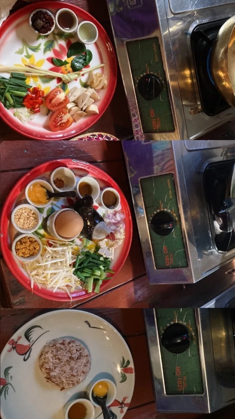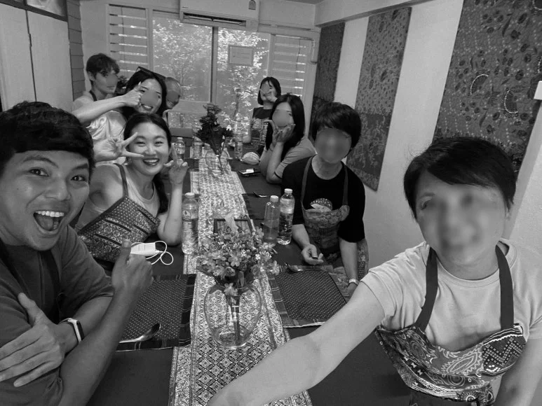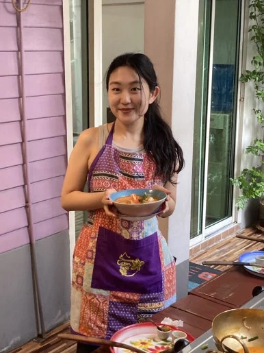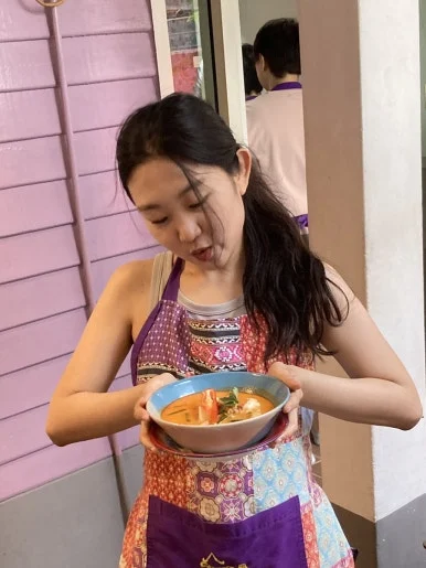 세팅되어 있는 재료를 직접 손질해보고, 입맛과 취향에 따라 준비된 개인 접시에 재료를 예쁘게 담아보기. 수업은 영어로 진행되는데 총 네 가지의 요리를 배우고, 요리 하나가 끝날 때마다 단체 테이블에서 함께 식사한다. 두 명이서 함께 재료를 손질해야 하는 상황에서는 홍콩에서 오신 마담과 함께했다. 조카가 대전에서 직장을 다닌다고 했는데, 방콕에서 나의 도시 대전이 언급돼 영광스러웠다.