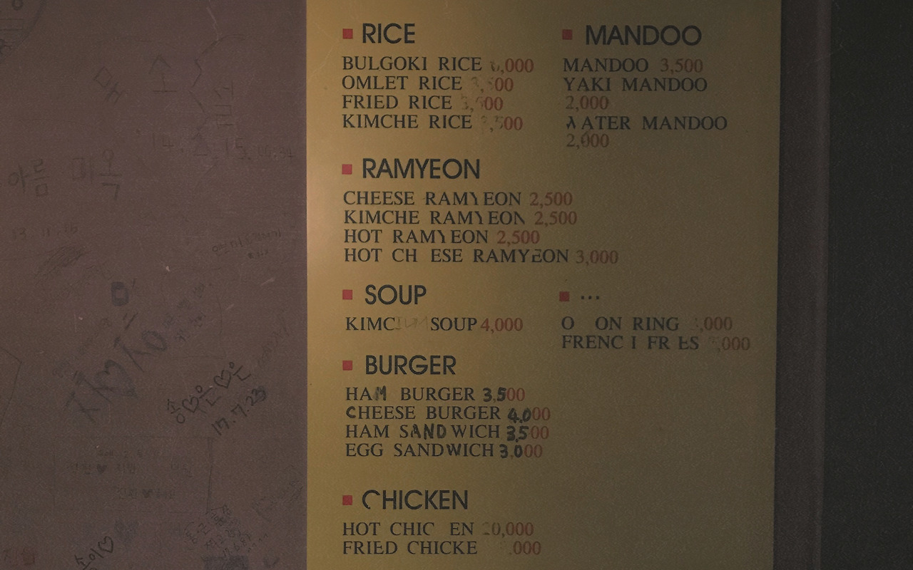 다음에 여기 오면 여기 어디쯤 우리의 오늘도 새겨보자. 그럼 넌 또 유난 떤다고 할 테고 나는 그러든가 말든가 하며 낙서를 하곤 물만두를 시킬 거야. 갑자기 웬 물만두냐고? 여기 물만두의 영어 이름이 정말 재밌거든. 단돈 2,000원 하는 WATER MANDOO.