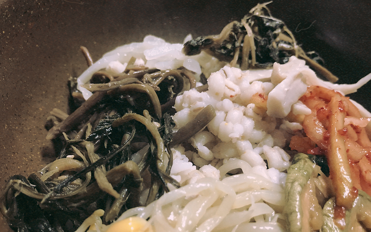 근데 다 다른 맛이 나는 거야. 내가 당연한 얘기를 대단한 발견이라도 한 것처럼 말하고 있나? 입안에 넣을 때 올라오는 향도 제각각, 꼭꼭 씹히며 물리는 식감도 제각각, 그 제각각인 나물들과 보리밥을 한데 섞어 고추장 양념과 함께 삼키니 또 다른 맛이 제각각. 집에서 명절에 남은 나물들을 양푼에 넣고 대충 비벼 먹을 때의 풍요로움이 다시 떠올랐어.