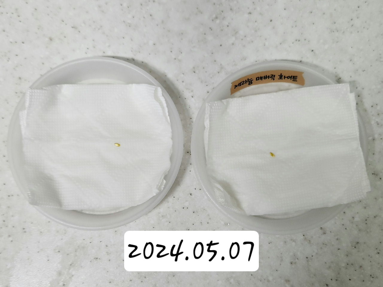 1일차: 5.7 키친타월 위에 씨앗을 올려 분부기로 흠뻑 적시듯 씨앗에 물을 주었어요.