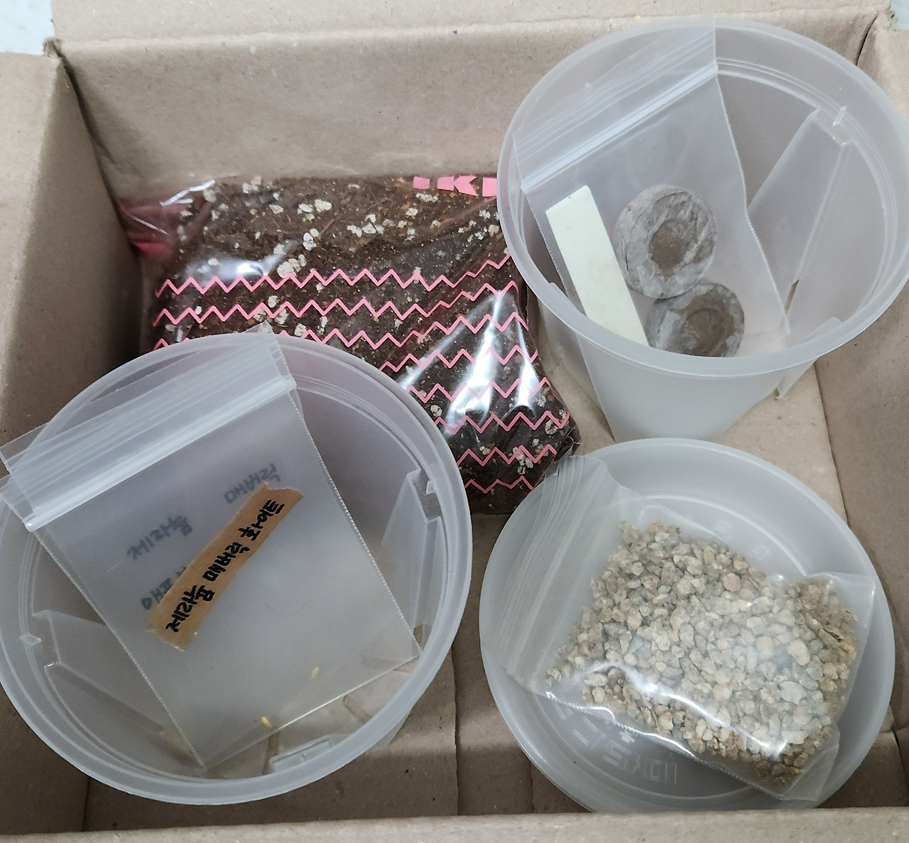 5월 초에 씨앗을 선물 받았어요. 연민메이트의 미희님은 정원사이자 식물들을 사랑하는 분이세요. 같이 씨앗에서부터 잎을 틔우고 꽃을 피우는 과정까지 함께 해보자고 하시며 식물 키트(플라스틱 화분 2개, 받침 2개, 씨앗 2개, 흙, 마사토)를 보내주셨어요.