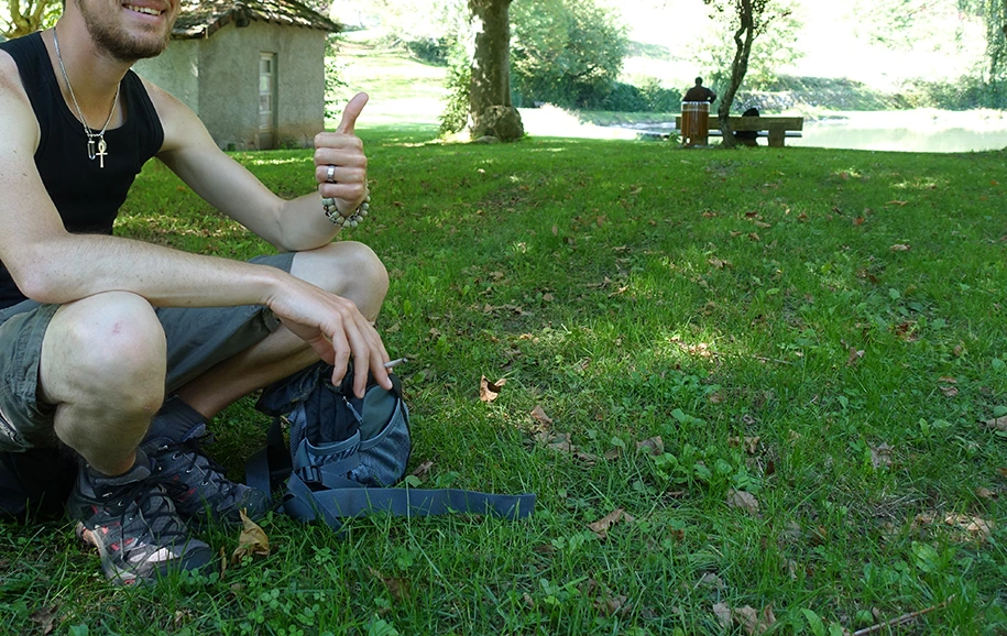 그렇게 걷다 보니 원래 쟝이 묵으려던 마을이 나온다. 예쁜 공원이 하나 나와 그 곳에서 잠시 숨을 돌린다. 쟝은 처음 보는 이에게도 반갑게 인사하는 능력을 가졌다. 낚시 하던 아저씨에게 반갑게 인사하고 수다도 떤다. 함께 걸어서 기분이 한결 나아짐을 느낀다.