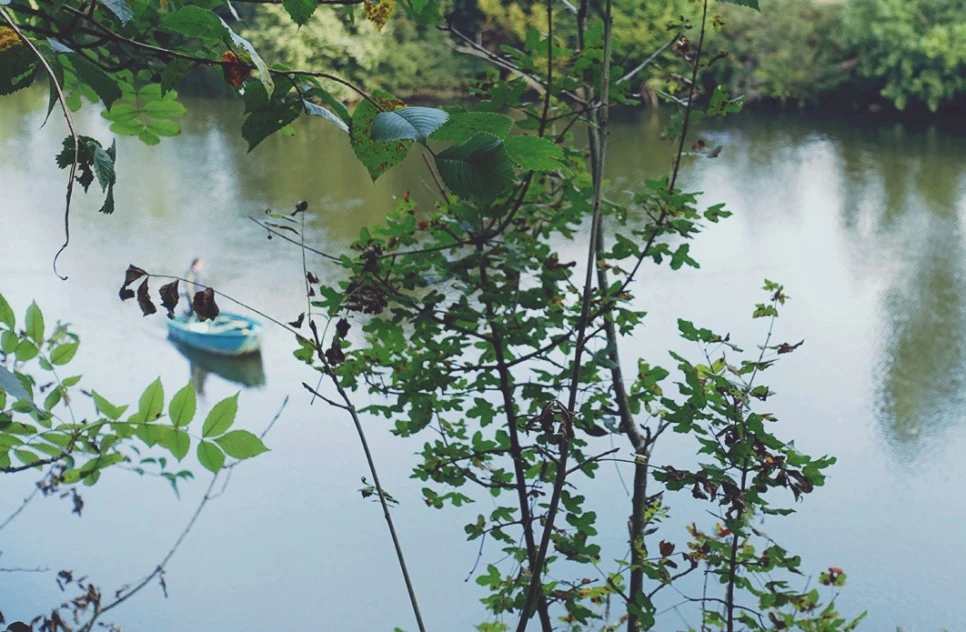강을 따라 난 숲길을 걸으며 강을 본다. 나뭇가지 사이로 낚시배가 보인다.