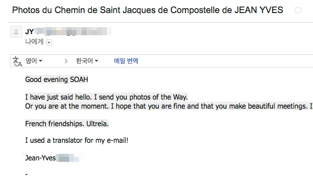 후에 쟝 이브가 자신이 찍은 사진을 보내주었다. 나도 길을 마친 뒤에 내 길들에 대해 메일을 보냈다. 그렇게 나는 언젠가 프랑스로 다시 가게 된다면 피레네 지역에 만나러 갈 친구를 하나 만들었다.