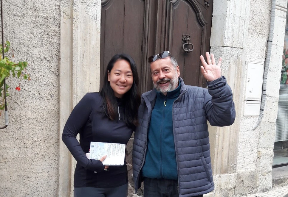 다시 관광안내소에 가려고 하는데 갑자기 쏘아? 하는 소리가 들려온다. 뒤를 돌아보니 순례 초반에 매일같이 마주치며 나에게 곤니치와 하면서 장난스레 인사하던 3인방 중 가장 에너지 넘치던, 쟝 이브이다! 다시는 못 볼 줄 알았는데 이렇게 만나니 너무 반갑다. 얼싸안고 비즈하고 난리가 났다. 지나가던 사람들이 쳐다봐도 상관이 없다.