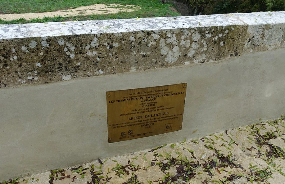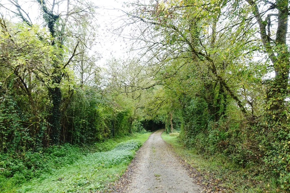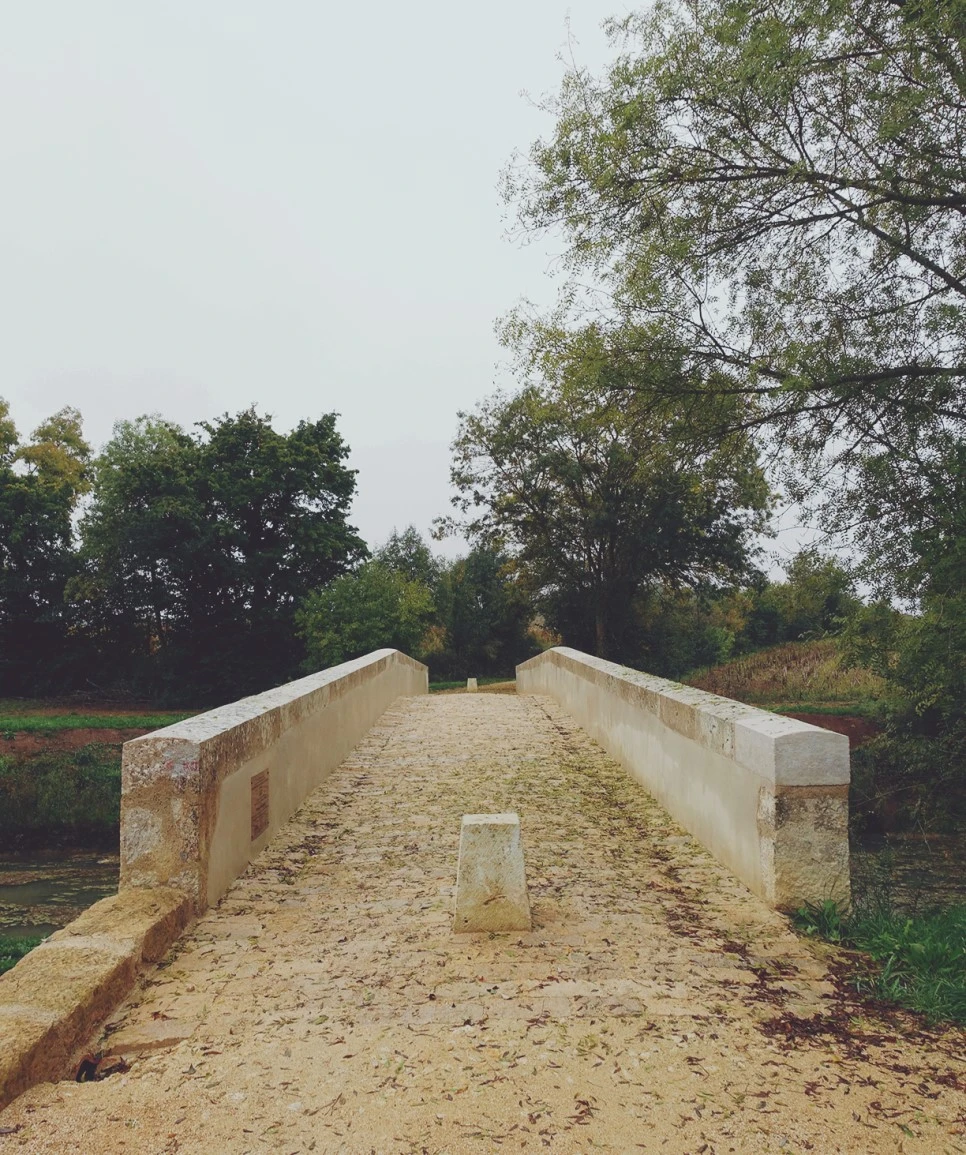 대충 식사를 마치고 출발한다. 아무리 둘러보아도 GR 하양 빨강 마크가 보이지 않아서 성당 근처를 두리번거렸다. 웬만한 순례길들은 반드시 성당 근처를 지나가니까. 나뿐만 아니라 미국에서 왔다는 어느 부부도 헤매고 있었다. 그때 개 산책시키려고 나온 아주머니가 계시길래 얼른 잡고 물어본다. 비가 오는데도 개를 산책시키는 이 분에 조금 놀라면서. 그랬더니 아주머니가 바닥의 금속 마크를 알려준다. 유네스코 로고가 새겨진 금속붙이가 바닥에 줄지어있다. 돌이켜보니 생콤돌트도 그렇고 이곳 콩동도 그렇고 마을에 GR 마크 대신 유네스코 로고가 새겨진 동그란 금속 붙이가 있는 곳이 종종 있었다. 특히 예쁜 마을이라고 하는 곳일수록 더더욱. 예쁜 마을의 풍경을 해치고 싶지 않아서였을까.