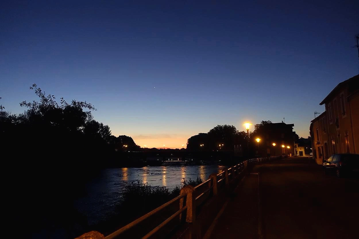 강에 비친 가로등 불빛이 아름답게 일렁인다. 사진에는 잘 보이지 않지만 아침부터 출근하는 차들이 저 다리 위에서 꽤 밀려 있었다. 지방 소도시에서도 아침의 교통체증은 피할 수 없는 모양이다.