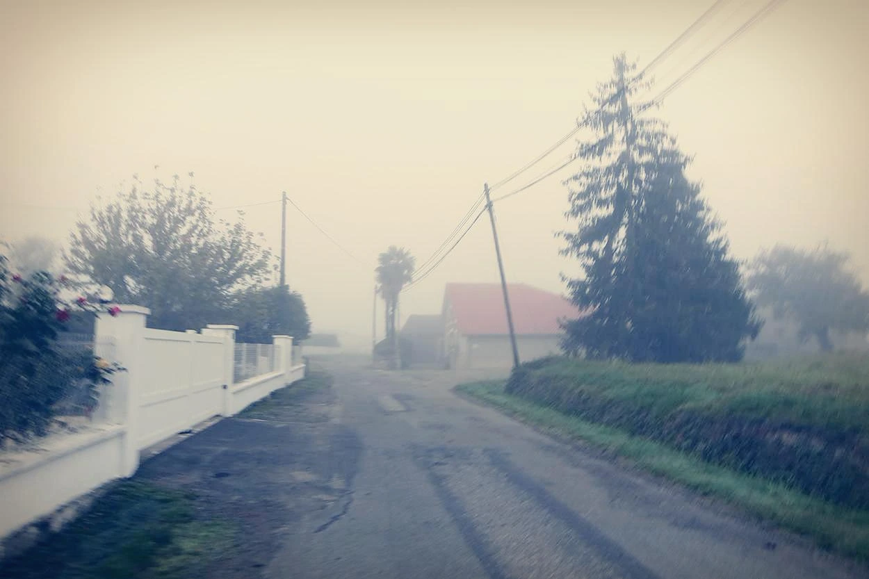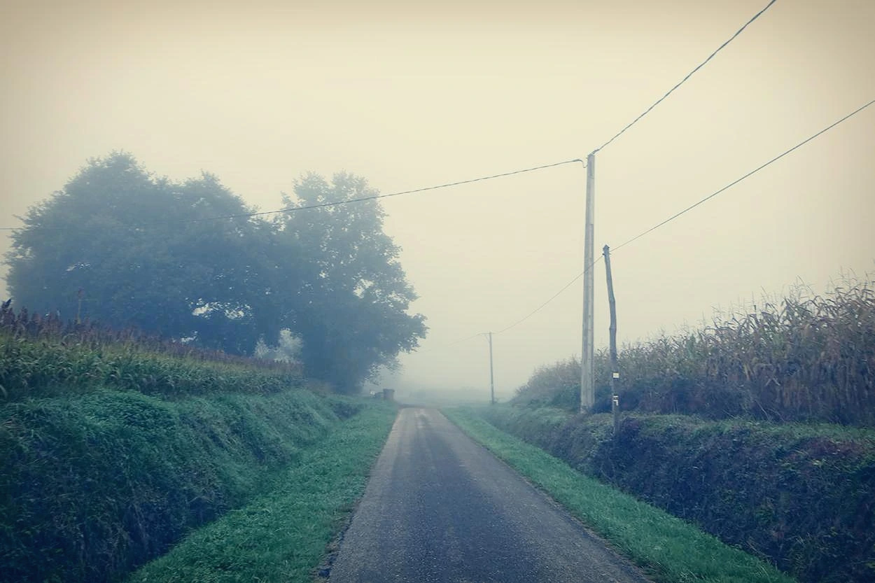 크리스티앙 아저씨는 얼마나 빨리 갔는지 뒤꽁무니도 보이지 않는다. 대신 어디서 묵었는지 모를 몸집이 토실한 할아버지 하나가 저 앞에 보인다. 얼른 따라잡아 언덕을 다 올라가니 찻길을 따라 길이 이어진다. 이후 마을을 지나가는 길로 빠진다. 이 길을 걷고 있으니 해가 뜨고, 갑자기 자욱한 안개가 마을을 뒤덮는다.