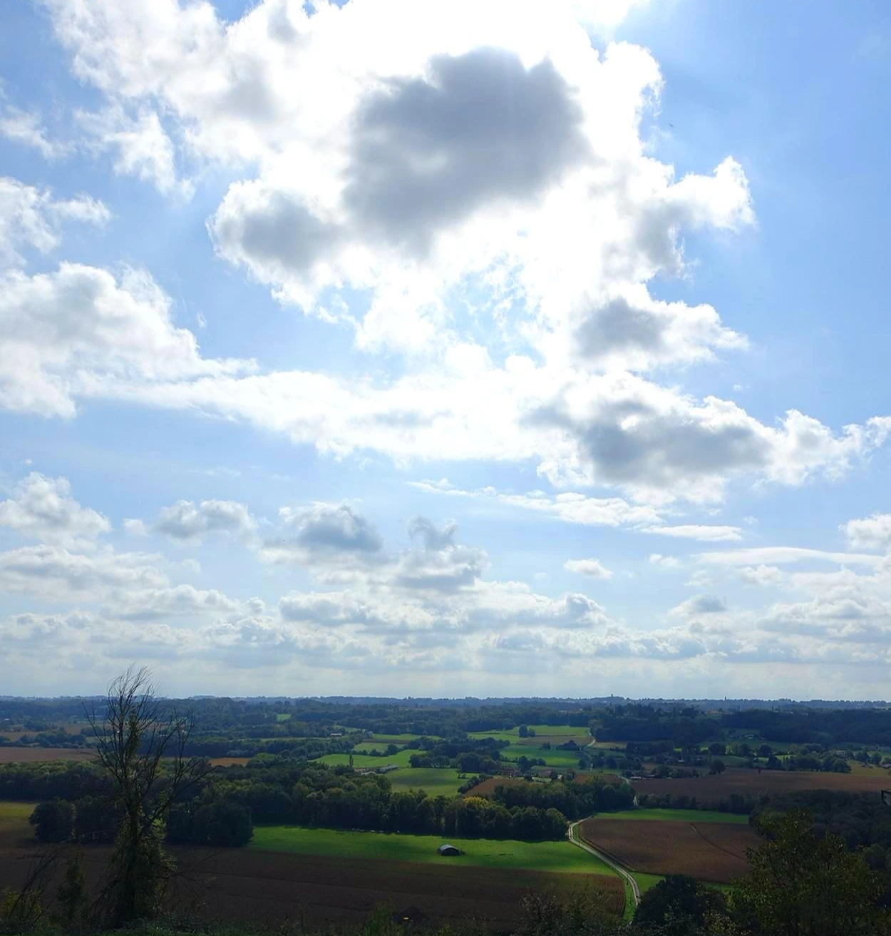 프랑소와즈, 쟝미셸, 그리고 나는 괴롭지만 목표까지 가기 위해 무거운 발걸음을 옮긴다. 핌보를 나서자 마자 가파른 내리막과 너른 밭, 그 사이를 지나는 길이 있다. 하... 너른 밭 사이를 지나는 길은 그림자도 없어서 어쩔 수 없이 이글거리는 빛을 다 쪼이며 가야 한다. 어쩔 수 없다! 더위에는 훌렁훌렁 벗고 가볍게 민소매 차림으로 걷는게 최고이다. 이미 타는 건 포기했다.