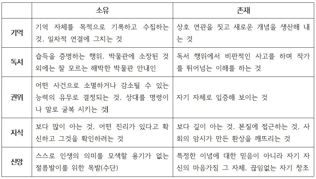 이 책에서는 여러 가지 가치관을 소유와 존재의 개념으로 대조하여 제시한다. ‘학습’에서의 소유는 필기나 암기를 하는 것으로 그것을 알았다고 생각하는 것이다. 여기에는 새로운 것에 대응하려는 마음가짐이 포함되어 있지 않다. 반면 존재는 고찰하고, 수용하고, 대응하는 모든 능동적인 행위이다. 이때는 새로운 관념이나 의문이 꼬리에 꼬리를 물고 떠오른다. 대학생 때 듣고 싶어 넣은 과목과 어쩌다 보니 끼워 넣은 과목의 집중도가 어떻게 달랐는지 떠올려 보자. 한 쪽은 수업시간마다 질문 거리가 떠올랐을 것이고 내가 하고 있는 다른 것에까지 연결되고 확장되는 아하 모멘트를 겪었을 것이다. 그 과목을 공부할 때는 시간이 빨리 흐른다. 어쩔 수 없이 넣은 과목은 어땠는가. 나눠주는 유인물이나 달달 외워 시험이나 잘 보자는 생각으로 수업에 임하고, 내 기억 표면에 발라놨던 공부 내용들이 시험 종료와 함께 사라지는 것을 경험하지 않았는가? 이런 예에 비추어 보면 학습에서 말하는 존재는 탐구이다. 그리고 시험 결과가 아니라 공부를 한 과정 전체인 것이다.