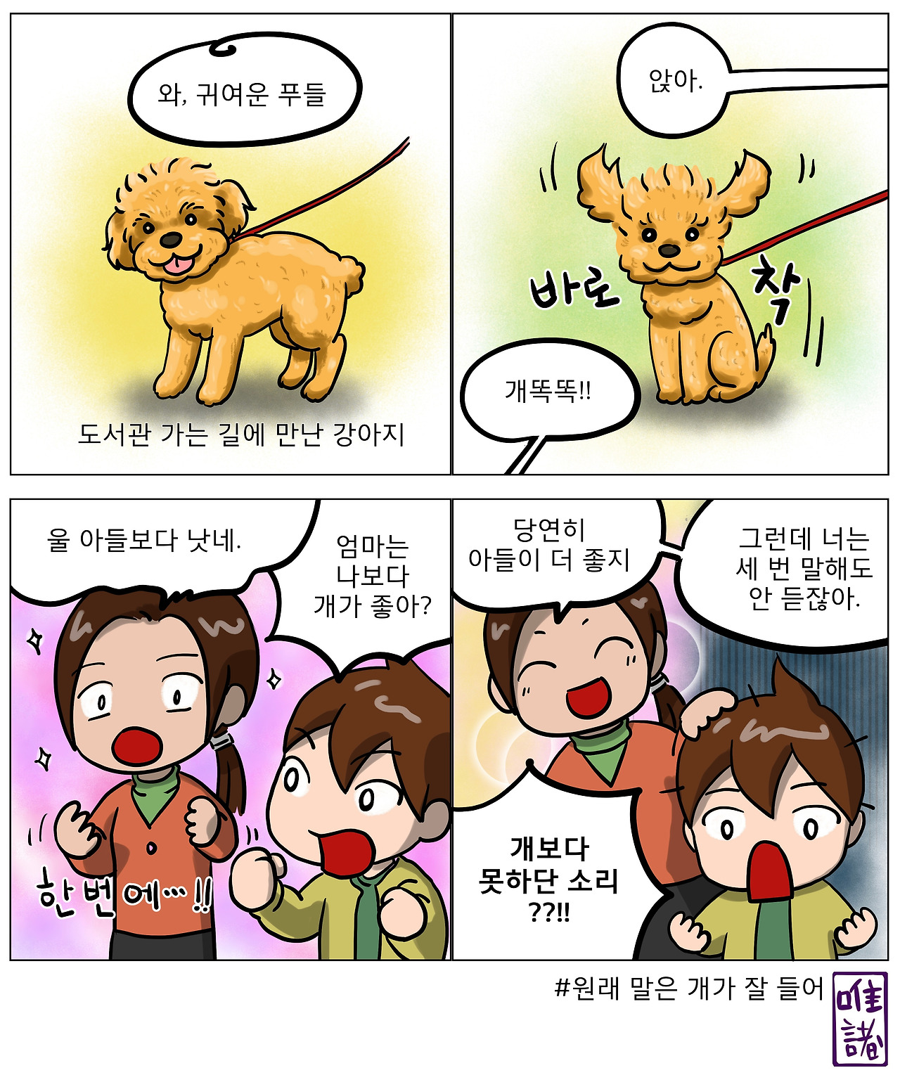 그래서 주인과 산책 나온 개를 자주 마주친다. 개는 앉으라는 명령에 엉덩이를 착 내렸다.