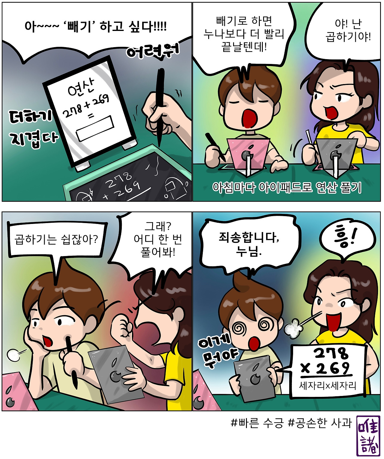 “더하기는 너무 어려워. 빼기로 했음 벌써 누나보다 빨리 끝났을 텐데.”