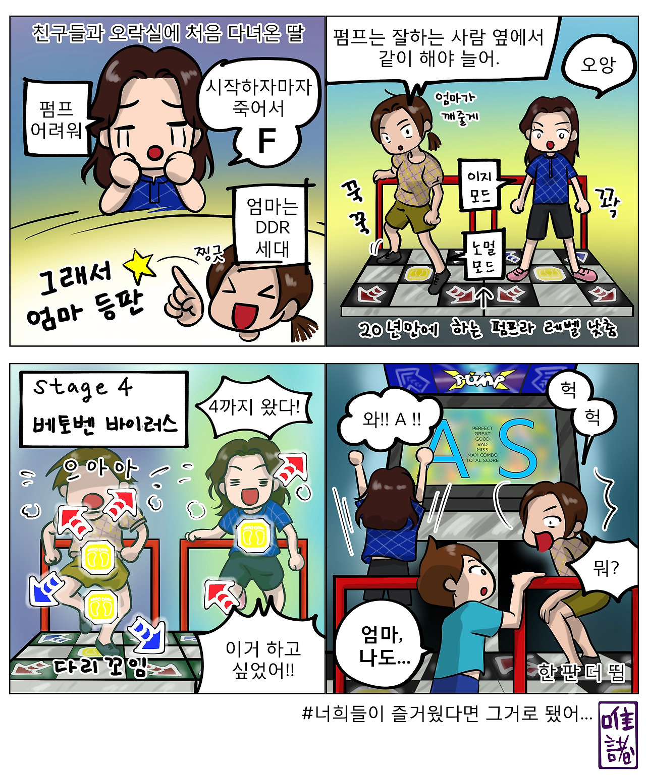 친구들과 시내 오락실을 놀러 간 날 딸은 처음으로 펌프(펌프 잇 업)를 했다. 재미있어 보여서 시도했는데 시작하자마자 첫판에서 바로 게임오버.