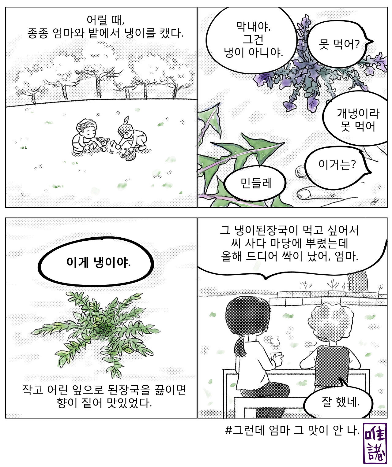 초봄이나 늦가을이 되면 엄마와 종종 과수원에서 냉이를 캤다.
