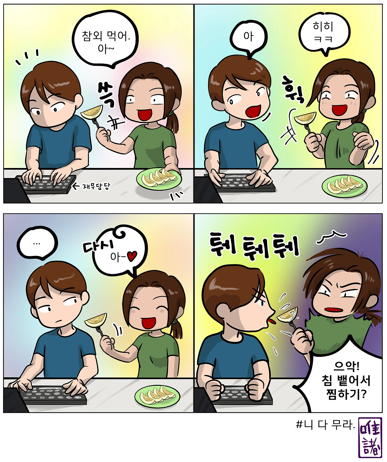 평소에 진지한 캐릭터인 남편이 갑자기 침을 뿌린 게 어이없었다.