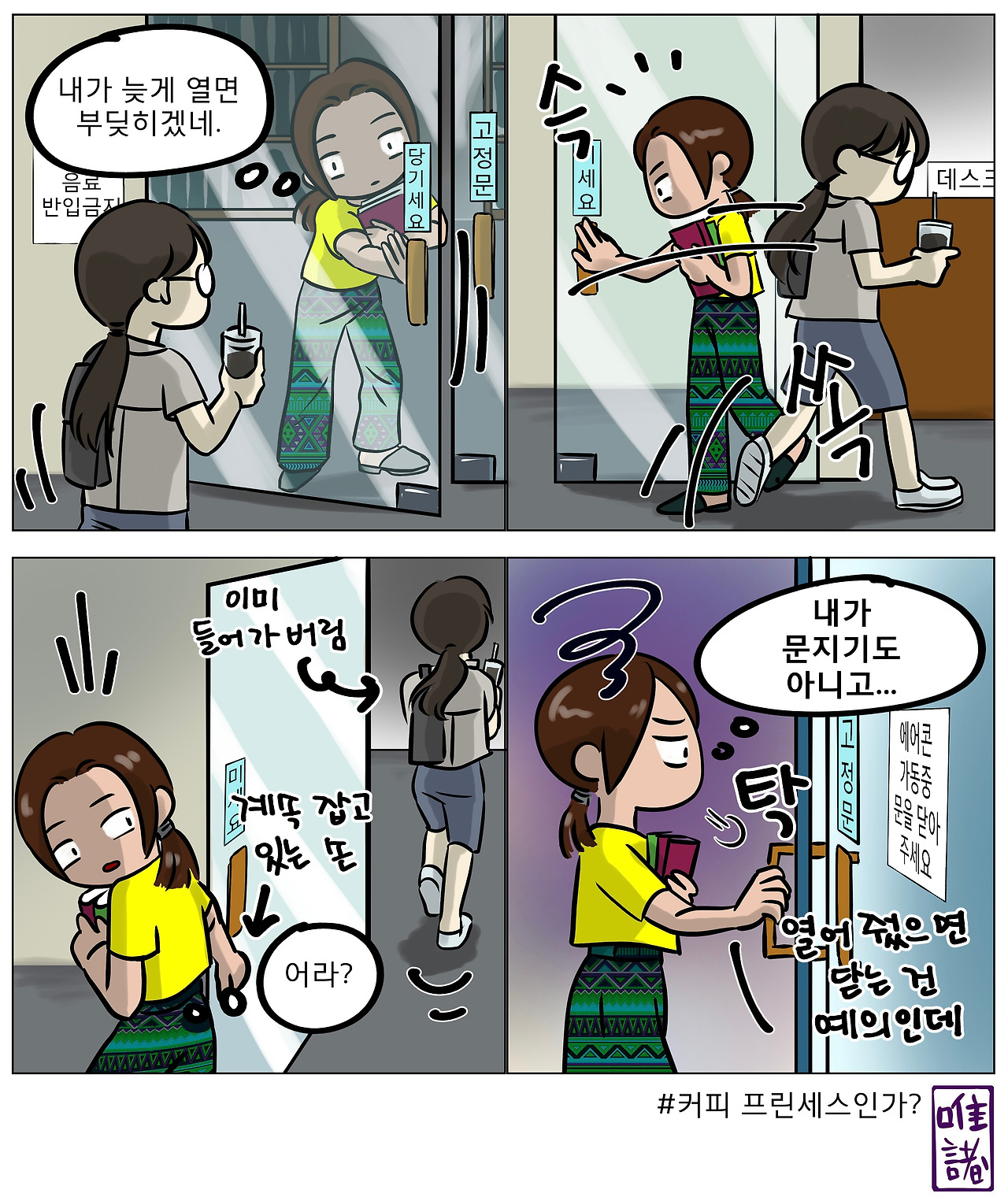 어느 날 커피를 한 손에 든 젊은 여성이 내가 열어준 문으로 도도히 걸어 들어갔다. 문을 잡아주려는 행동은커녕 작은 눈 마주침 조차도 없었다. 말 그대로 몸만 쏙 들어가 버렸다. 순간 나는 내가 공주님을 맞이한 문지기가 된 줄 알았다. 밀어야 하는 문이라 상대가 부딪힐까 배려하며 열었는데, 이 배려가 무색하게 시종이 된 기분이었다.