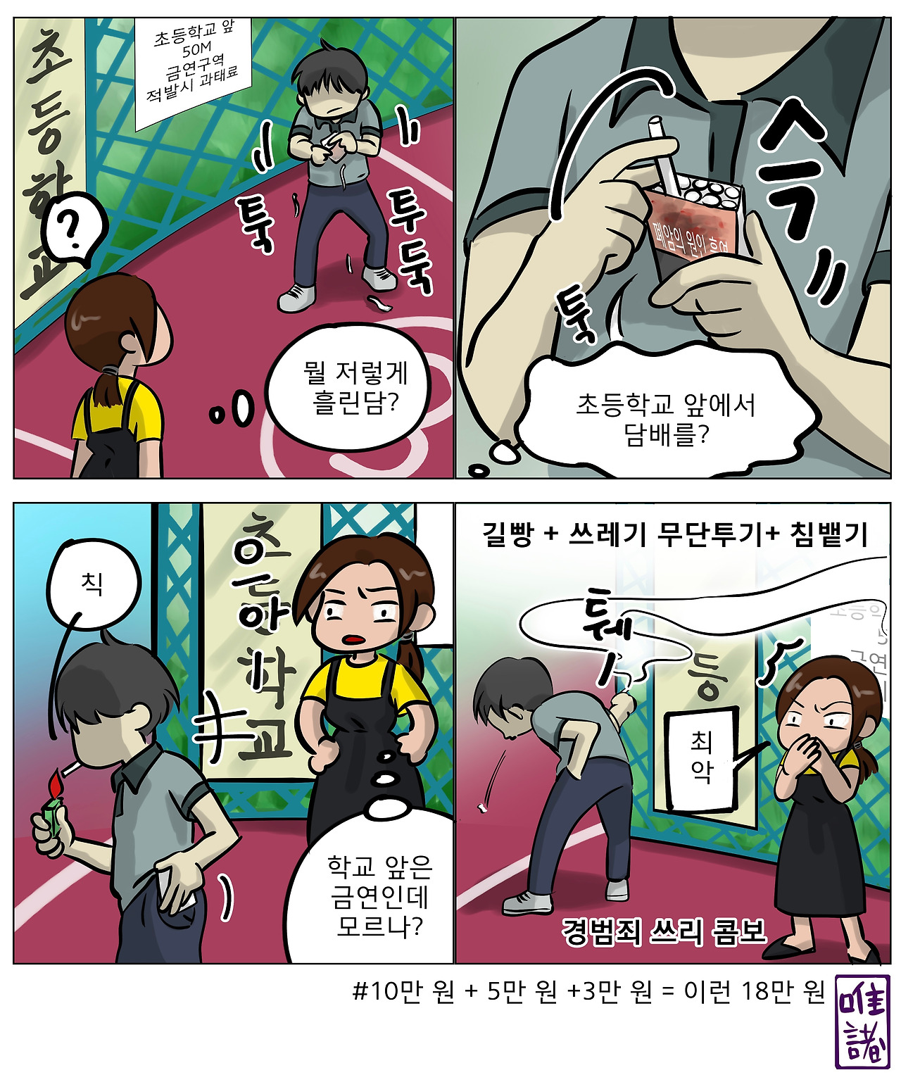 내가 바로 촬영해서 신고했다면, 금연구역위반 10만 원, 무단투기 5만 원, 침 뱉기 3만 원 총 18만 원의 상품권을 받을 수 있게 했을 텐데. 가끔은 학교 앞에 잠복해서 무개념 범법자들을 신고하는 상상을 하곤 한다.