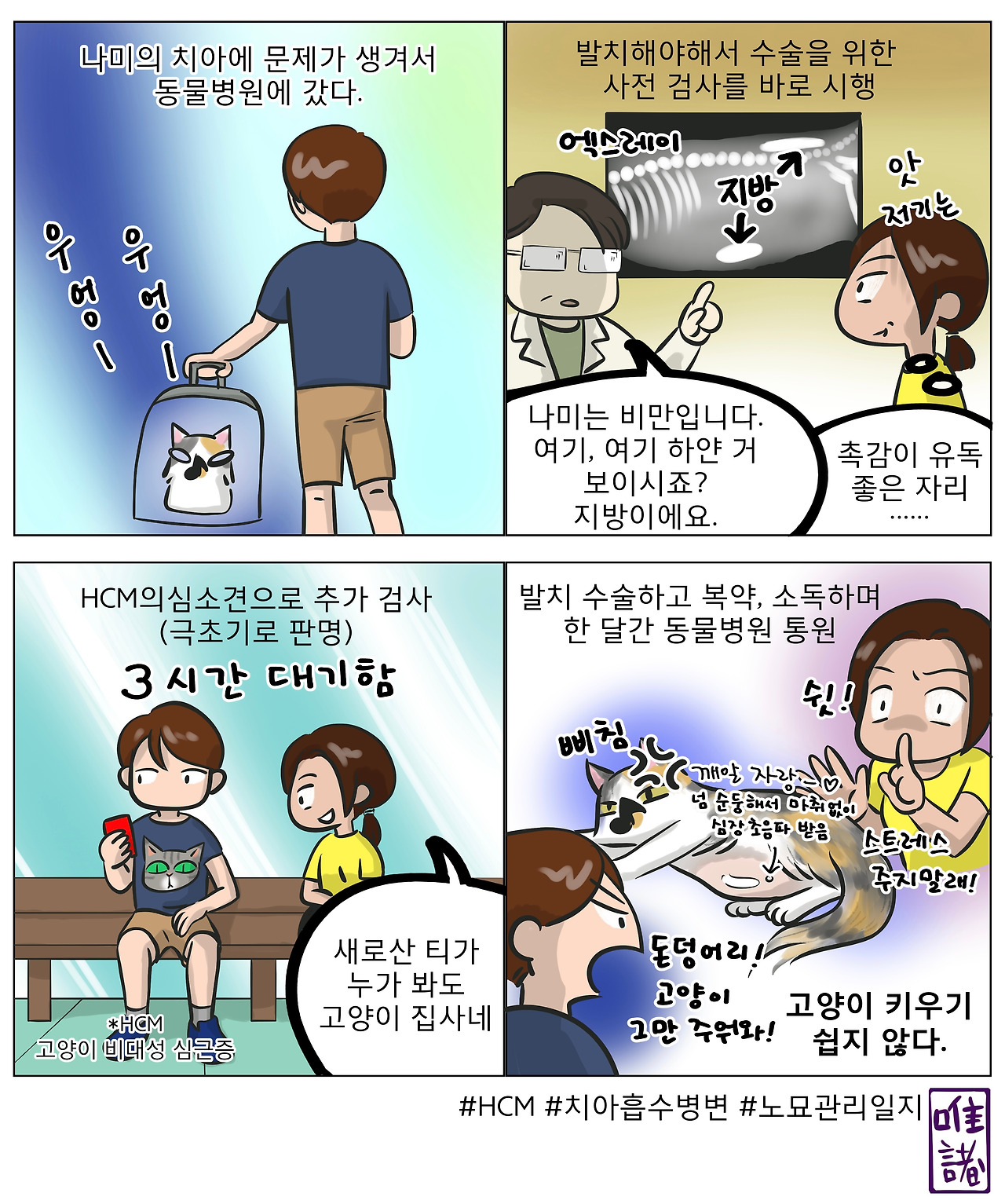 나미는 평소 활동량도 많고 잘 먹고 잘 잤다. 조금 비만이긴 하지만 높은 곳도 단번에 올라갈 정도로 잘 날아다닌다. 양치도 잘 받아서 이빨문제도 금방 눈치챘다. 그런데도 이렇게 소리 없이 병이 찾아온다. 나미는 다시 검사에 들어갔다. 갑상선 쪽 문제를 함께 확인하기 위해 다시 피검사를 했고.(이건 초반에 뽑은 혈액으로 하기로 했다.) 심장은 초음파를 봤다. 초음파라기에 내가 임신했을 때 받은 것처럼 간단히 몇 분 보는 것이라 생각했는데, 고양이 심장 초음파는 누워서 30분쯤 본단다. 그래서 고양이는 대부분 마취를 하고 시행한다. 그런데 나미는 순해서 괜찮을 거 같다며 의사가 마취 없이 진행했다. 진료 시작과 끝에서 모두 나미가 얼마나 얌전한가에 대한 선생님들의 칭찬이 쏟아졌다. 나미가 원래 이랬나? 하긴. 매일 은단이에게 하악질을 날리긴 했어도 사람들에게는 꽤 너그럽긴 했었다. 세 시간의 긴 검사가 끝나고 ‘노르웨이 숲’ 품종 특성상 발생확률이 높은 HCN(고양이 비대성 심근증)으로 진단받았다. 다행인 점은 극초기라서 별다른 관리는 필요하지 않다는 점이다. 자주 수면 중 호흡수를 체크해 주라는 말과 함께 Taptempo라는 앱도 추천받았다.