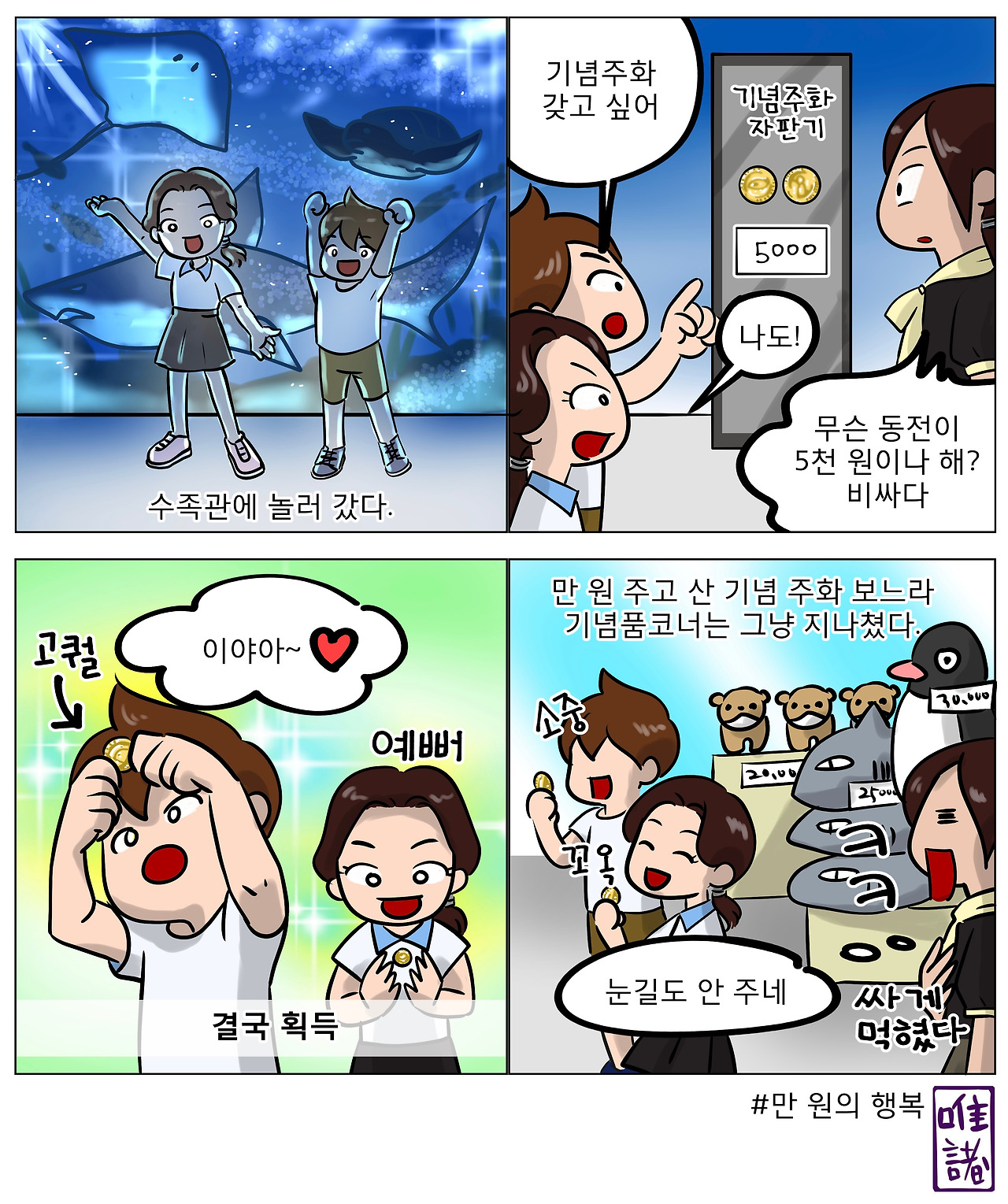 기념주화는 한 개당 5천 원이었다. 펭귄이 그려진 주화 모형을 보더니 딸도 가지고 싶다고 말했다. 두 개 만 원이네. 저 조그만 가짜 동전을 만 원이나 주고 사야 하다니 고민하던 찰나에 할아버지가 손주들을 위해 카드를 내미셨다. 아이들 손에는 상어와 펭귄이 그려진 주화가 각각 쥐어졌다.