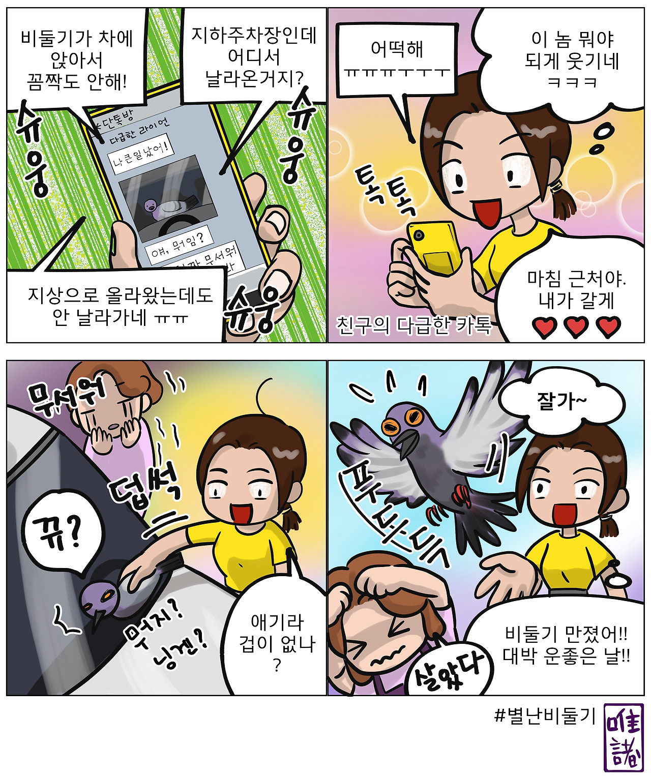 지하주차장에서부터 무임승차로 지상까지 올라온 넉살 좋은 비둘기 녀석도,