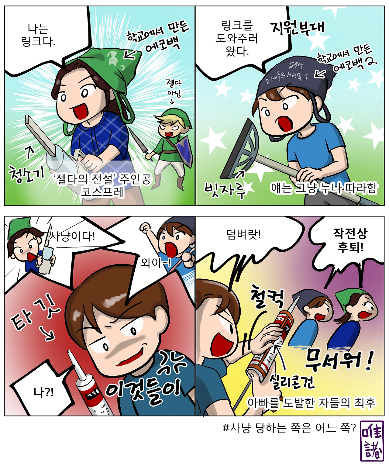 아빠 닮아 동체시력이 좋은 딸은 게임을 할 줄 아는 나이가 되자 ‘링크의 사격 트레이닝’을 모조리 클리어해 놨다. 사격 트레이닝이라길래 아기자기한 게임인 줄 알았건만, 흉흉한 마을 배경에 뼈다귀 괴물이 정신없이 쏟아지고 타깃은 너무나 빨리 움직여서, 정작 게임을 하려고 산 나는 스테이지 1도 못 깼다. 그런 게임을 하루 30분의 제한 시간에도 딸은 모든 스테이지를 다 깨 놨다. 이 ‘링크의 사격 트레이닝’의 주인공 링크는 사실 ‘젤다의 전설’이라는 다른 게임의 주인공이다. 그런데 대부분의 사람들은 링크의 이름을 젤다로 착각하곤 한다. 링크를 가리키며 “얘가 젤다죠?”하는 인터넷 밈도 있으니까. 여하튼 우리 애들은 이 게임 덕분에 링크를 링크로 제대로 알고 있었고, 링크의 트레이드 마크인 모자 비슷한 걸 뒤집어쓰며 곧잘 링크 흉내를 냈다.