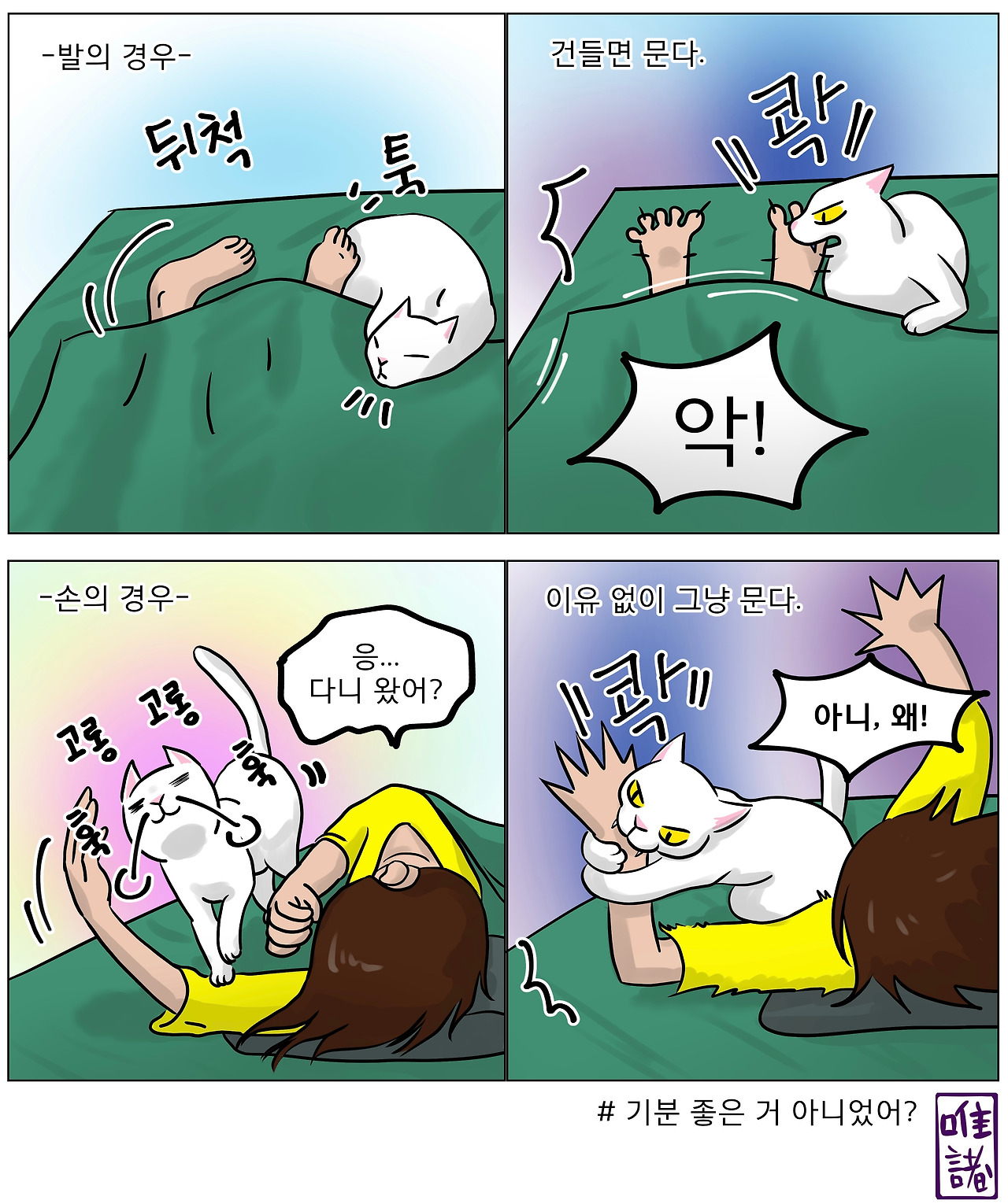 재미있는 점은 그런 장난을 나와 딸에게만 건다는 점이다. 아빠나 아들한테는 낯가리는 모양인지 장난을 안 친다. 친하다고 생각해서 나름 애정표현이라 생각하면 나쁘지는 않지만, 그래도 갑자기 물리면 타격이 너무 크다. 다른 때는 참을 만 한데 자다가 발 물리면 벼락을 맞은 기분이다. 눈빛 신호라도 줘서 예상이라도 가능하면 좋겠다.