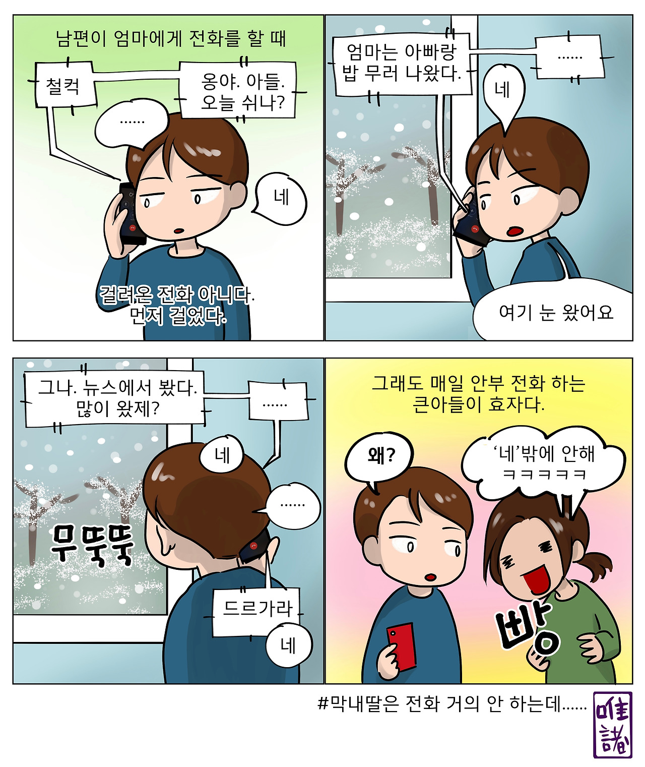 #안부전화 #눈왔어요 #시어머니통화 #엄마랑전화 #장남스타일 #막내스타일 #남편스타그램 #소박과궁상사이 #컬러툰 #월요일연재 #일상툰 #인스타툰 #4컷만화