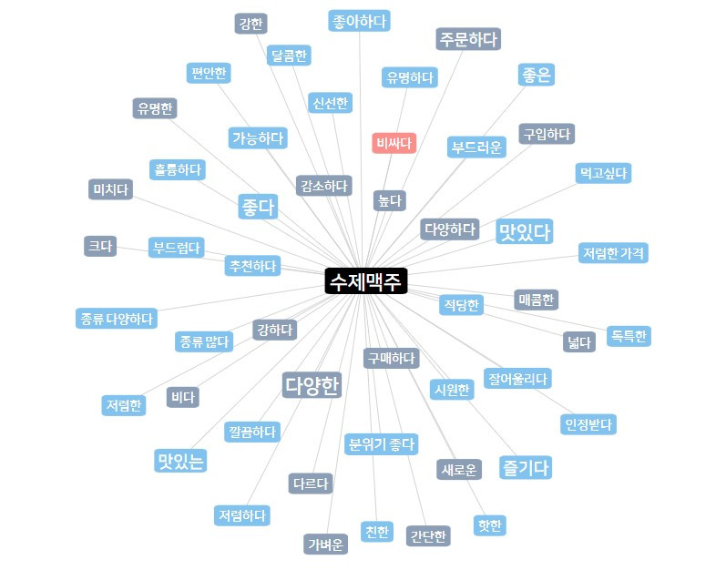 그렇다면 이 수제맥주는 무엇이고 사람들의 생각은 어떠할까? 소량 생산의 수제맥주는 장인이 한 땀 한 땀 만들었기에 당연히 비싸야 할 것 같은데, 실제로 소셜데이터의 연관어는 어떠할까?