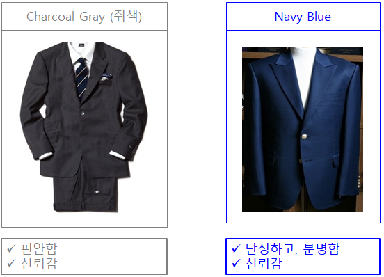 첫 번째, 정장의 색상은 Charcoal Gray라고 하는 쥐색이나 Nave Blue라고 하는 짙은 군청색이 가장 무난하다. 정장 상의 Button은 필자가 취업할 때만 해도 Three Button이 유행이었으나, 최근에는 Two Button으로 넓은 가슴을 강조하는 Sytle이 유행이므로 최신의 유행을 고려하여 Style을 선택하면 된다.