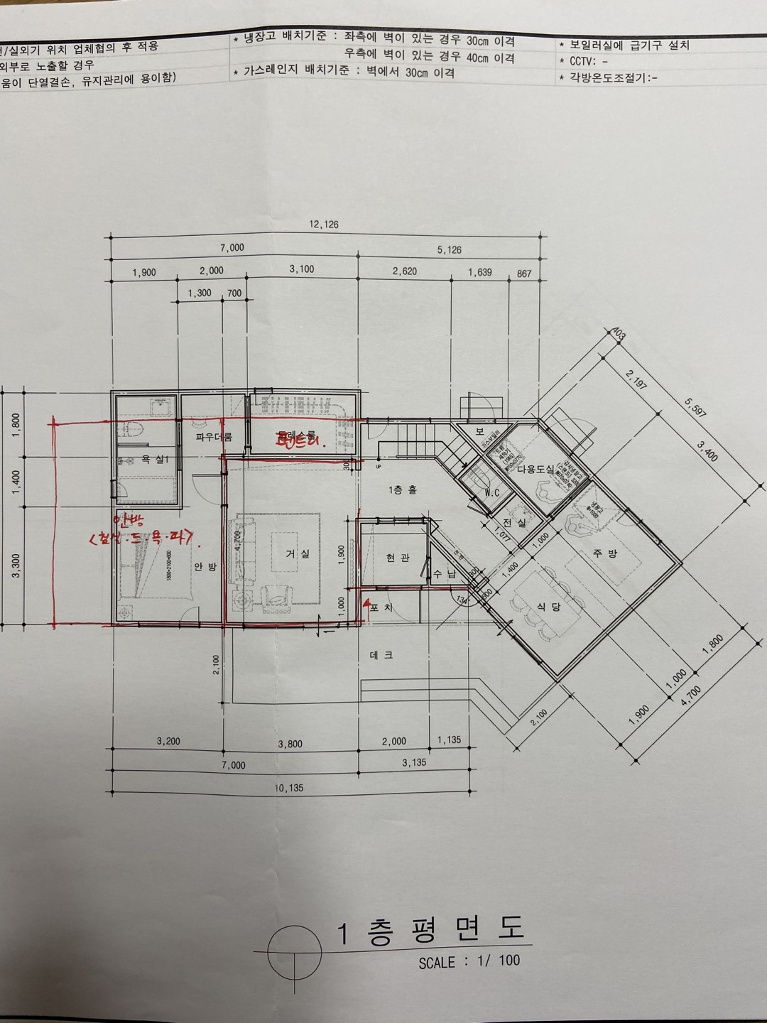 첫 도면을 보곤 마냥 좋았다. 이 정도면 너무 괜찮은데? 우리가 요구한건 다 담긴게 아닌가? 라며 아내에게 시선을 돌린 순간 내 입가에 번진 미소는 순식간에 사라졌다. 아내는 기대 이하랬다. 1층에 너무 많은걸 욱여넣다 보니 각각의 공간이 작아졌고, 불필요한 동선과 버릴 공간도 많다고 했다. 그리고 무엇보다, 아파트 평면도와 다를게 없다 했다. 아내가 원하는 걸 해야 집안에 평화가 깃드는 법. 나는 입을 다물고 고개를 끄덕였다.