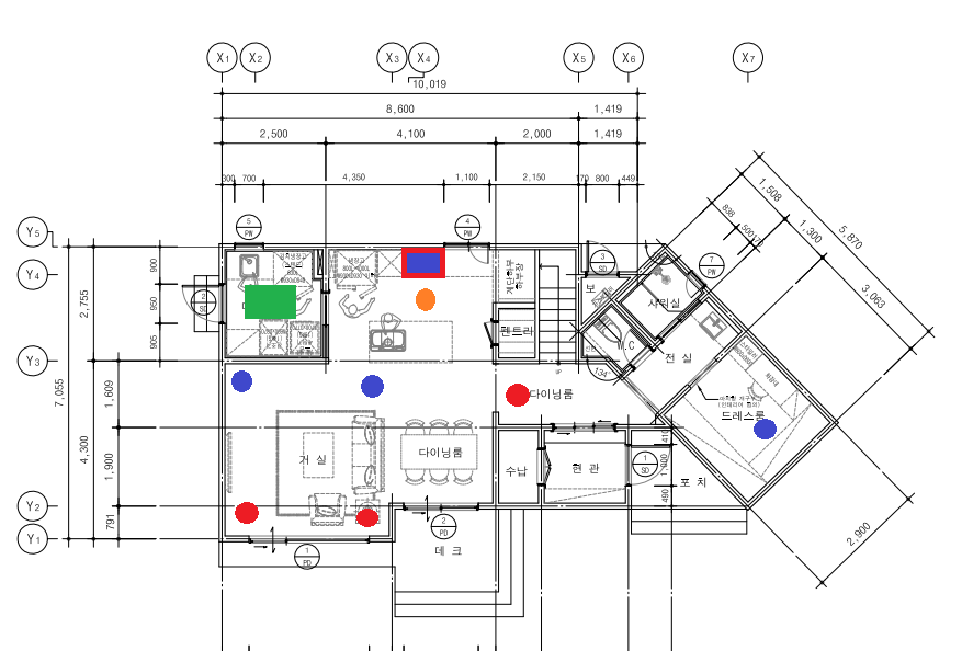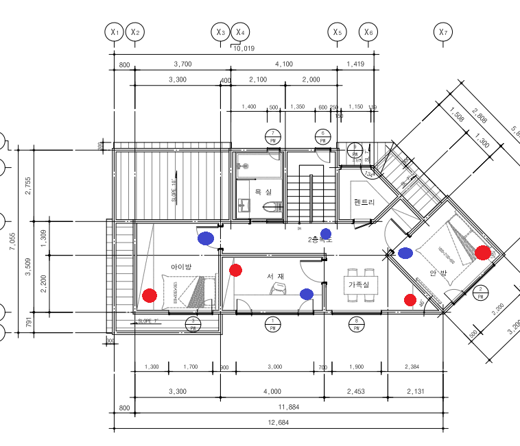 방마다 에어컨을 다느냐(거실 2개, 방 3개), 필요한 곳에만 다느냐(거실 1개, 방 2개)가 고민이었다. 예산은 250 정도 차이 났다. 업체 쪽에선 1층 거실과 부엌에 각각 한 대씩 매립하는걸 제안했는데 우린 그렇게까지 많은 에어컨이 필요할까 싶었다. 또한 신혼집에서 두 번의 여름을 겪어보니 안방에 에어컨을 트는 경우가 많지 않았다. 그래서 안방엔 실링팬만 넣고 에어컨은 안 넣기로 했다. 결국 전체 3개로 선택했는데, 이는 단독주택 2층의 더위를 만만히 본 우리의 실책이었다.