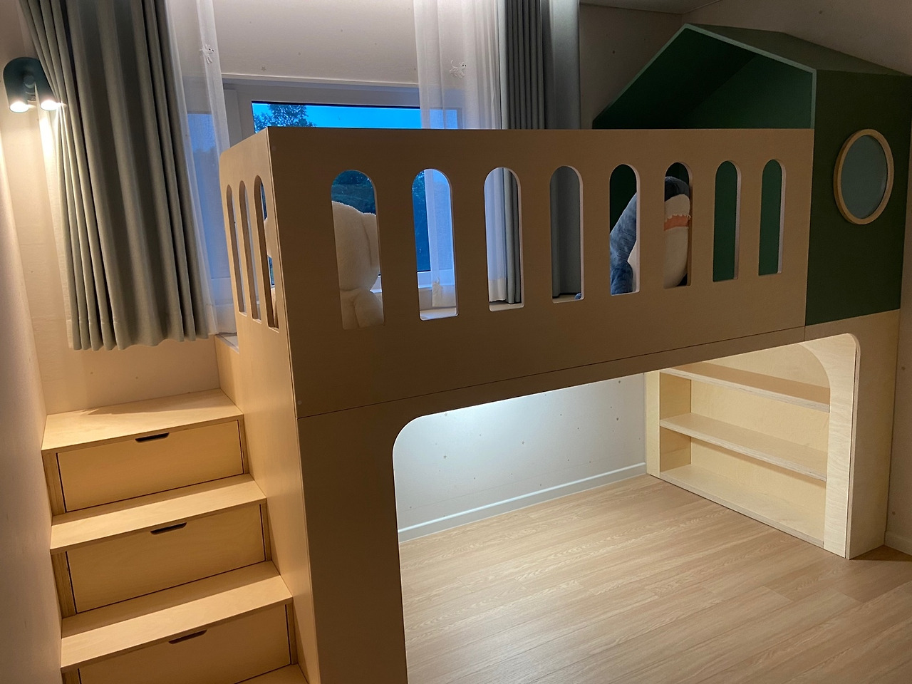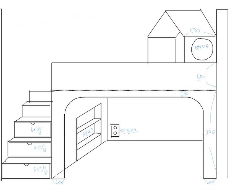 다음으론 2층 벙커침대였다. 기성품이 아니라 방 사이즈에 맞게 제작을 해서 만들어주고 싶었다. 어렸을 때 2층 침대가 갖고 싶었는데 여건상 쉽지 않았다. 어린 시절은 1층에서 자고, 좀 더 크면 2층을 자는 공간, 1층은 아이만의 아지트로 만들어주고 싶었다. 하지만 벙커침대를 제작할 수 있는 업체를 찾는게 힘들었다. 처음엔 가족실 윈도우 시트를 만들어 줄 수 있다는 업체에 벙커침대 제작도 맡겼다. 우리가 직접 도면까지 그려주었고 업체 또한 만들 수 있다고 했는데, 입주 한 달 여를 앞두고 우리가 그려준 디자인으론 만들기 어렵다고 했다. 마치 이제 와서 니들이 취소할 수 있겠어? 이런 느낌으로 말이다. 그런데 뭐 까짓것 침대 좀 늦게 들어온다고 문제가 되나. 새로운 업체를 찾아 매우 만족스러운 결과물을 받았다.