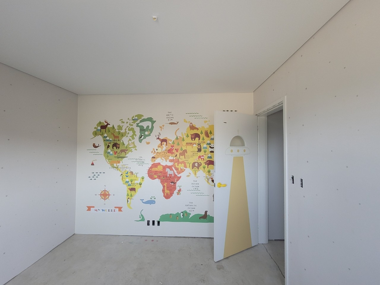 첫 번째는 아이방의 세계지도 벽지였다. 실제 축도로 그린 지도는 아닐지라도, 세상이 어떠한 모양으로 생겼는지, 우리나라가 얼마나 작은 나라인지 깨닫고 큰 꿈을 꾸게 하고 싶었다. 나중에 다른 나라에 나가서 산다 해도 좋고. 시트지 같은걸 붙이는 방법도 있지만 최근엔 세계지도가 그려진 실크벽지도 많이 나오고 있었다. 그중 아이가 좋아할 만한 대륙별 동물이 그려져 있는 벽지를 택했다.