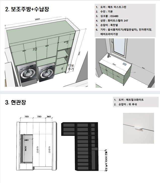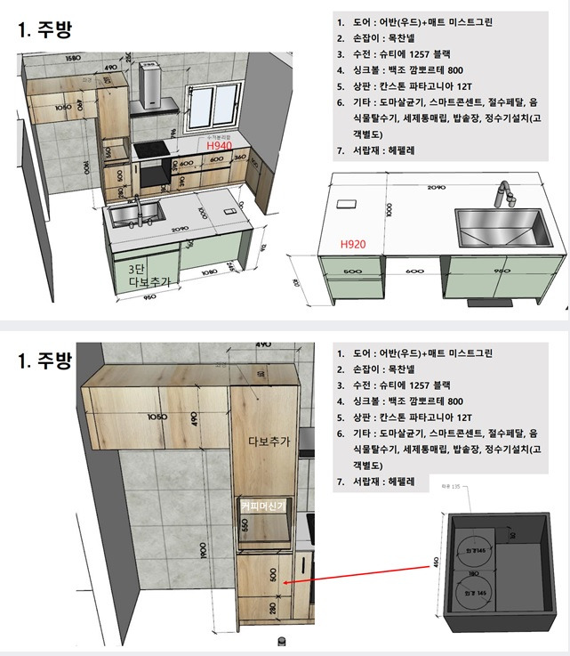주방에 들어가는 제품들도 어찌나 종류가 많은지. 국내 유명 인테리어카페에선 마치 '국룰'처럼 취급되는 품목들이 있었는데 그런 제품을 많이 썼다. 내가 원한건 하나였다. 싱크대 높이를 좀 높게 만들자는 것. 아무래도 나도 아내도 키가 크다 보니 일반적인 높이의 싱크대에서 설거지를 하면 허리가 너무 아팠다. 보통 높이보다 10센티 정도 더 높여서 디자인했다.