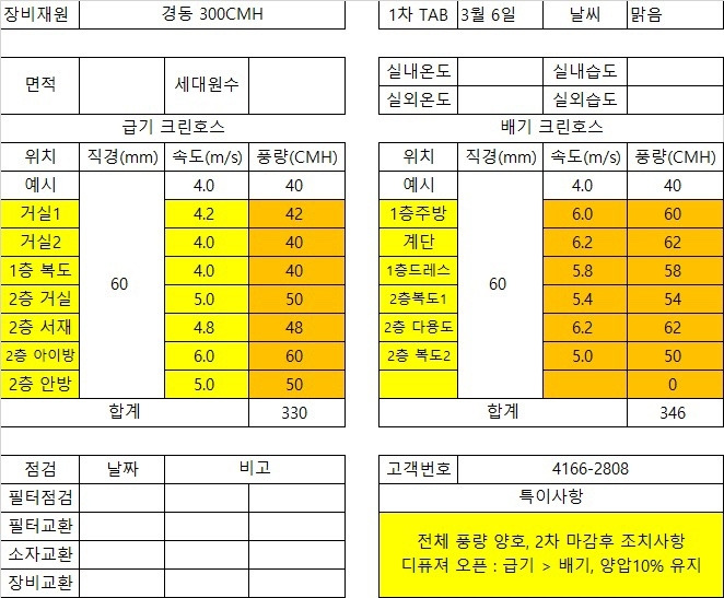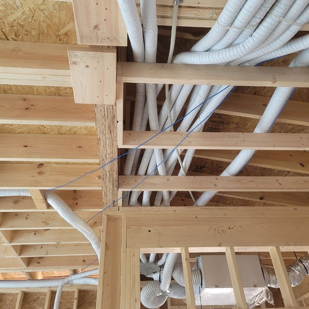 각 층의 천장 틀 사이엔 에어컨과 열회수 환기장치 배관을 설치한다. 이 두 가지 장치는 설계 단계에서 반영하지 못하면 스탠드 에어컨을 쓰거나 벽에 구멍을 뚫는 환기장치를 설치해야 한다. 환기장치는 공기 유압설정도 중요해서 마감 전에 흡배기구의 풍량 테스트도 한다. 이 모든 걸 하고 나면 물이 필요한 타일작업이 시작된다.