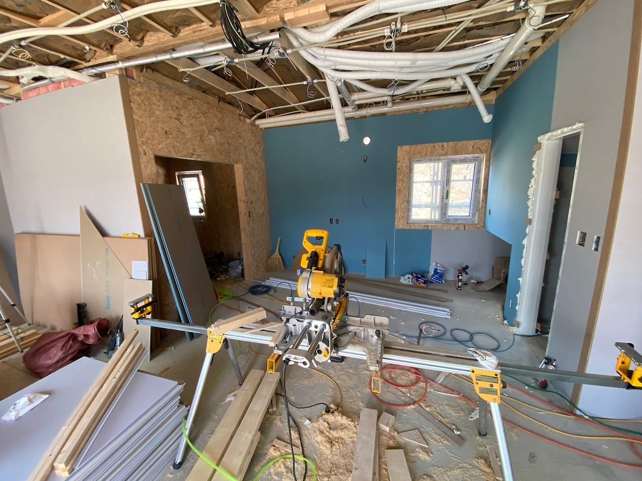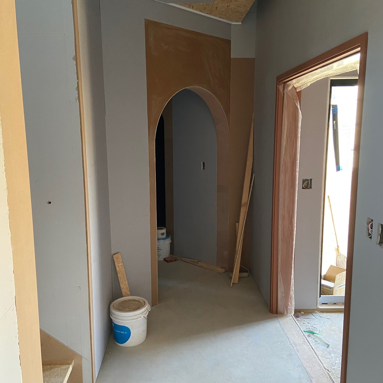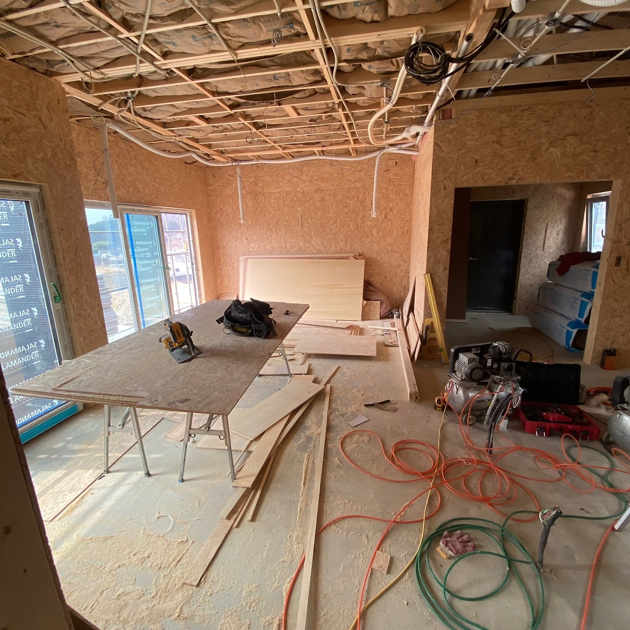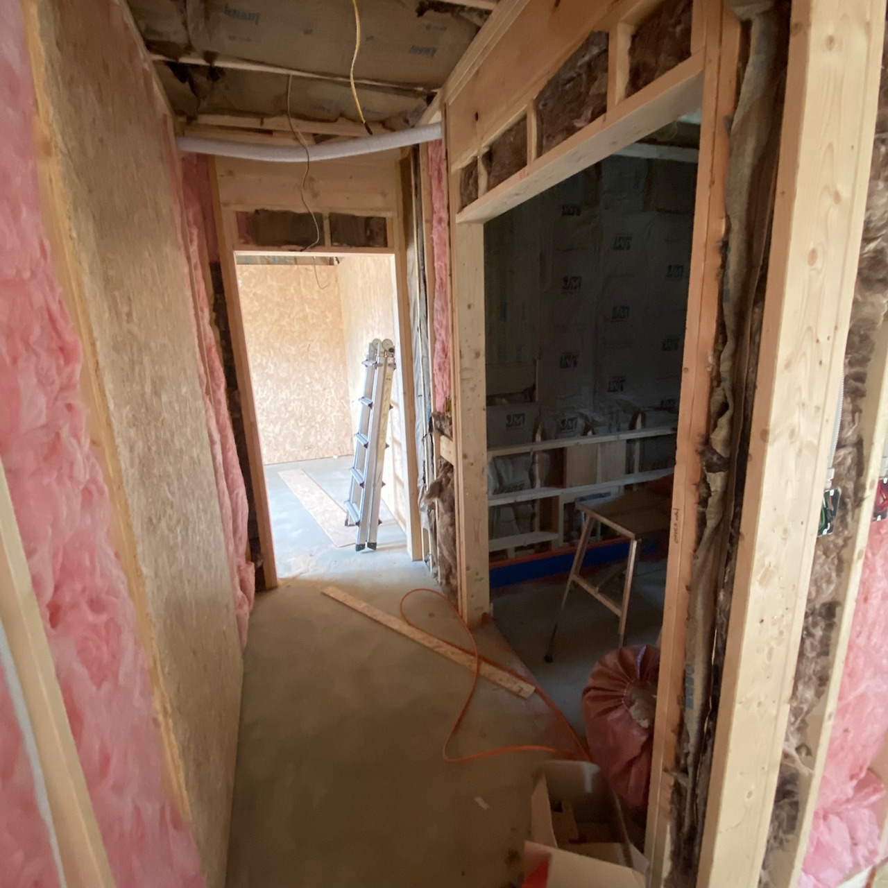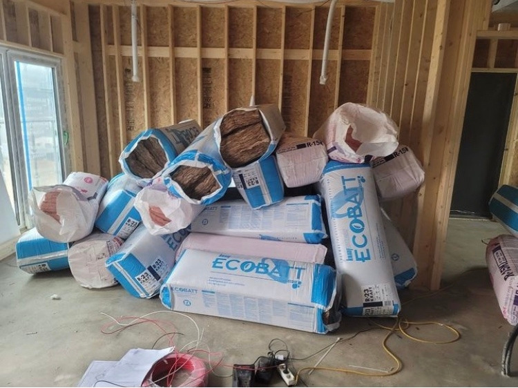 골조 완성 후엔 내부공사를 시작한다. 가장 먼저 벽면에 단열재를 채워 넣는다. 이 부분이야말로 집의 냉난방효율을 평생 좌우한다. 우리 집에 사용한 단열재는 글라스울이란건데 유리를 솜처럼 만든 섬유 제품이다. 그런데 유리가루가 섞여 있다 보니 단열재가 널브러진 실내에 오래 있으면 피부가 따끔거린다. 단열재를 붙인 후 내벽 마감을 한다. 단열재 위에 나무를 덮고, 그 위에 합판으로 마감하여 벽지를 바를 준비를 마친다.
