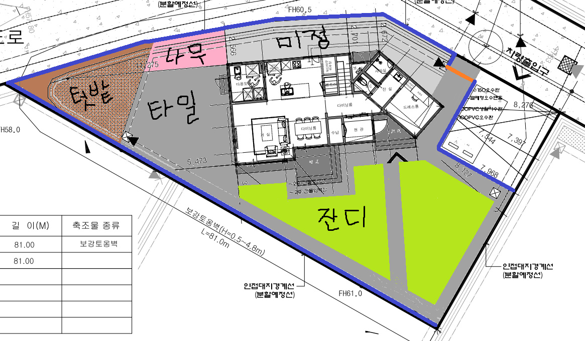 외벽 공사는 마감재까지 끝났기에 수도가 들어오고 동시에 부대토목도 실시하였다. 부대토목도 건축주가 별도로 수배해 실시한다. 아무래도 부지를 공사한 업체가 부대토목을 하는게 가장 좋기에 해당 업체에 의뢰했다. 부대토목은 말 그대로 마당을 공사하는 것이다. 배수관을 묻어서 물고임이 없도록 해야 하고, 잔디와 판석을 구분하여 깐다. 담장을 쳐서 외부와의 경계를 두고 안전도 확보한다. 우리 집 땅 모양이 사각형이 아니라 사다리꼴이다 보니 분리형 정원을 택했다. 상상하는 모습을 그림판으로 대충 그려 토목공사업체에 넘겼고 원하는 대로 가능하다는 답을 얻었다.
