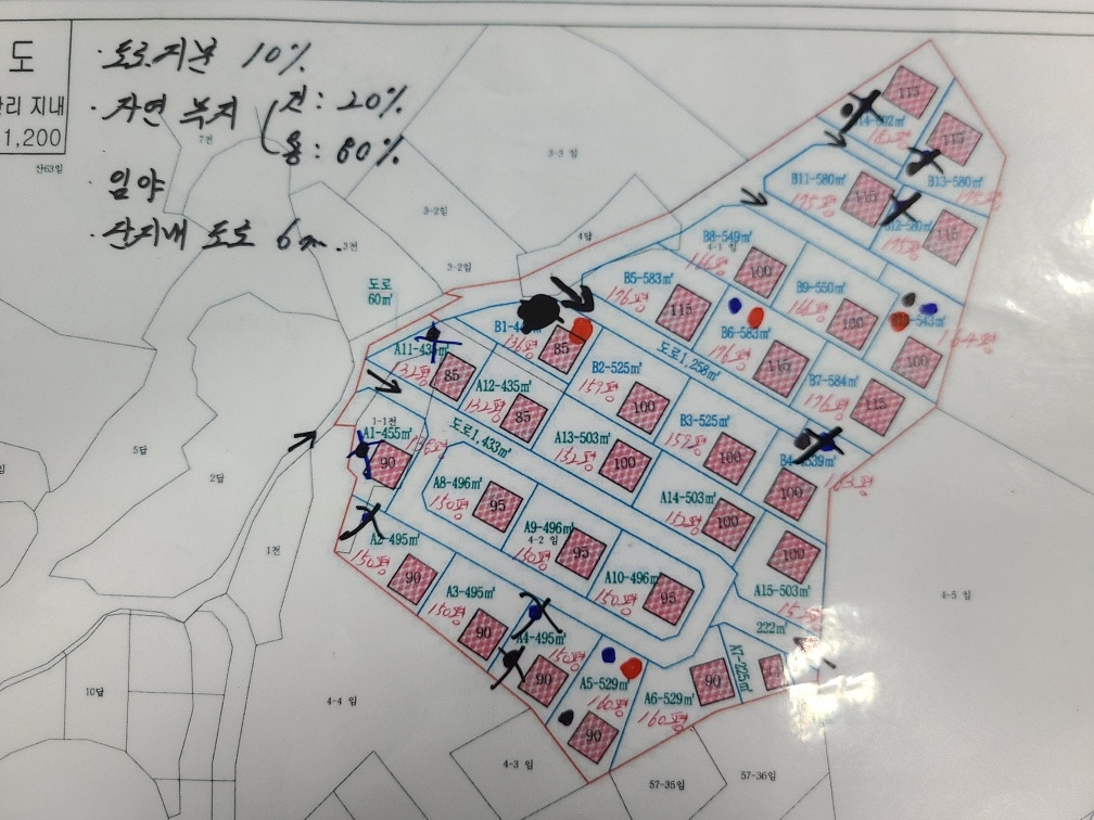 분양가는 평당 200만 원에 형성되어 있었다. 대부분 130~160평 사이였고, 많은 부지들이 이미 주인을 찾아서 남아있는 땅은 150평 이상 되는 큰 땅 한 두 개가 전부였다. 땅의 위치가 백프로 마음에 들지는 않았고, 세금과 기타 제반 비용을 포함하면 예상보다 토지 매입가가 많이 발생할 것 같아 일단 보류하기로 하고 중개사와 헤어졌다.