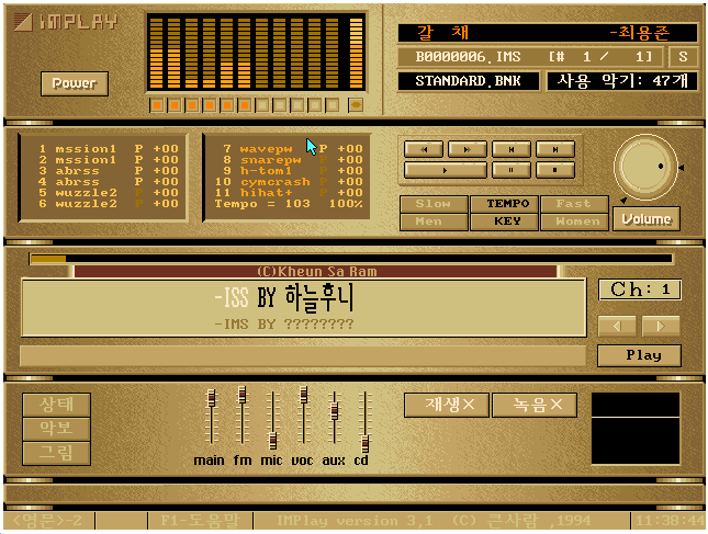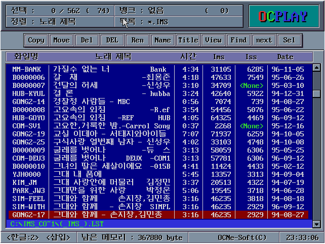이 때가 특히 기억나는 것이 PC가 노래방 역할을 했던 일이다. 정확하게 기억나지는 않지만 우리나라 고유의 파일형식아라고 들었던 [*.IMS] 파일이 있었다. 임플레이(IMPLAY) 또는 옥플레이(OCPLAY)라는 프로그램으로 재생하여 노래방처럼 사용하는 방식으로 선풍적인 인기를 끌었었다. 최신곡이 나오면 PC통신 자료실에 사람들이 만든 수많은 버전의 IMS 파일이 업로드 되었기에 ‘집안의 노래방’은 빠르게 업데이트 될 수 있었다.