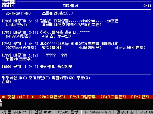하지만, 어디까지나 아버지의 이름으로 아버지의 아이디로 사용하는 것이었기에 형이나 나나 너무나도 조심스러울 수밖에 없었다. 나만의 아이디를 가지고 싶다는 꿈은 대학에 진학하고 나우누리 아이디를 만들면서 이룰 수 있었다. 나우누리에서 월4천원 정도의 가격으로 대학생에게 계정을 만들 수 있게 공격적인(?) 마케팅을 했었다. 이 때문일까 90년대 후반에는 많은 대학생들이 나우누리를 사용했다. 술을 먹지 않던 나로서는 매주 한 번 씩 우리과 선배들과 ‘정모 대화방’에서 이야기를 나누며 친해질 수 있었던 기억도 난다. 공강시간에 학교 중앙전산원에 친구들과 모여 앉아, 대학생들의 대화방 여기저기에 들어가 열심히 ‘채팅’을 하던 추억도 있다. 불특정 다수가 모이는 대화방에서 살아남기 위해서는 누구보다 빠른 타이핑이 필요했고, 타자수가 삽시간에 엄청나게 늘기도 했었다.