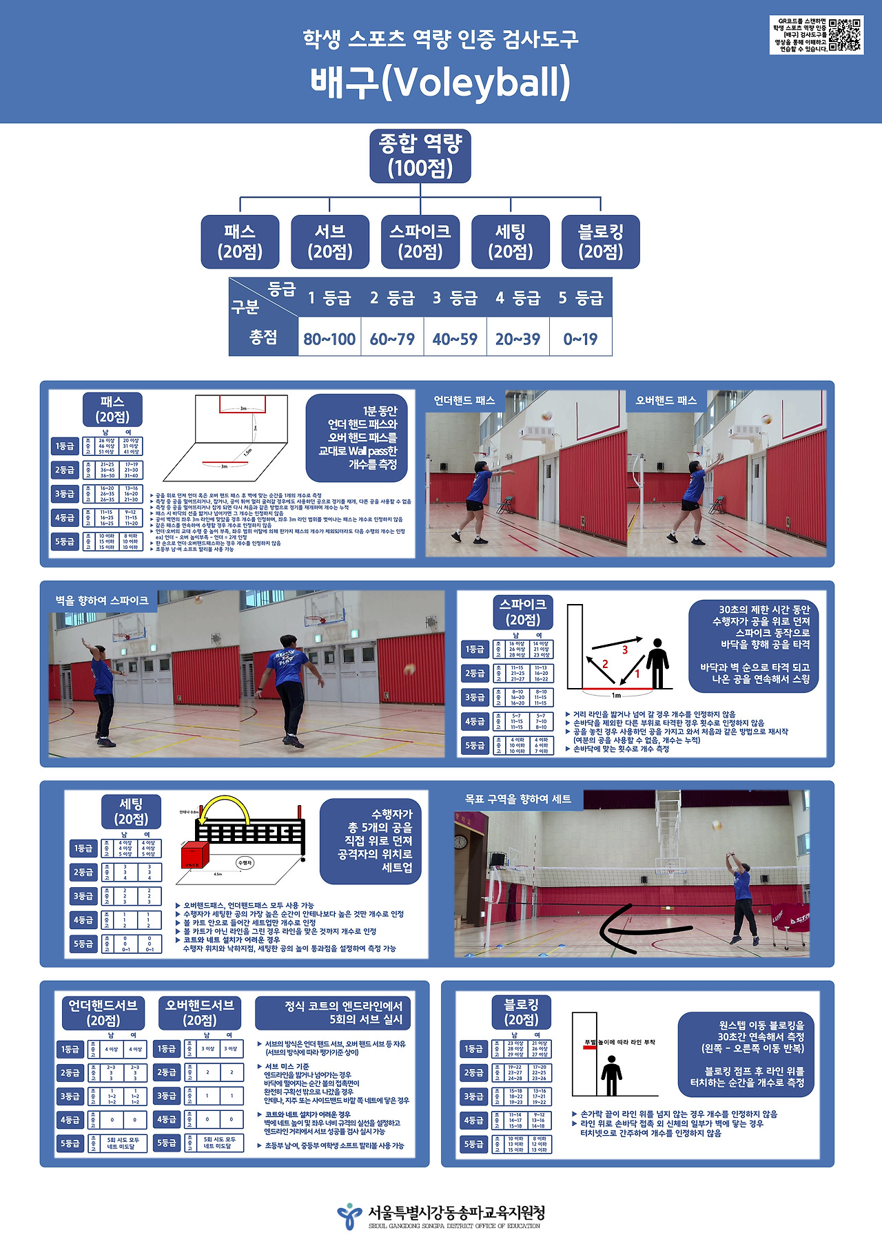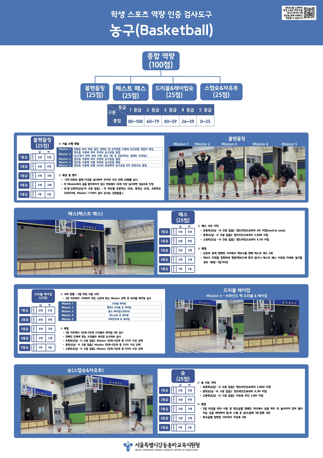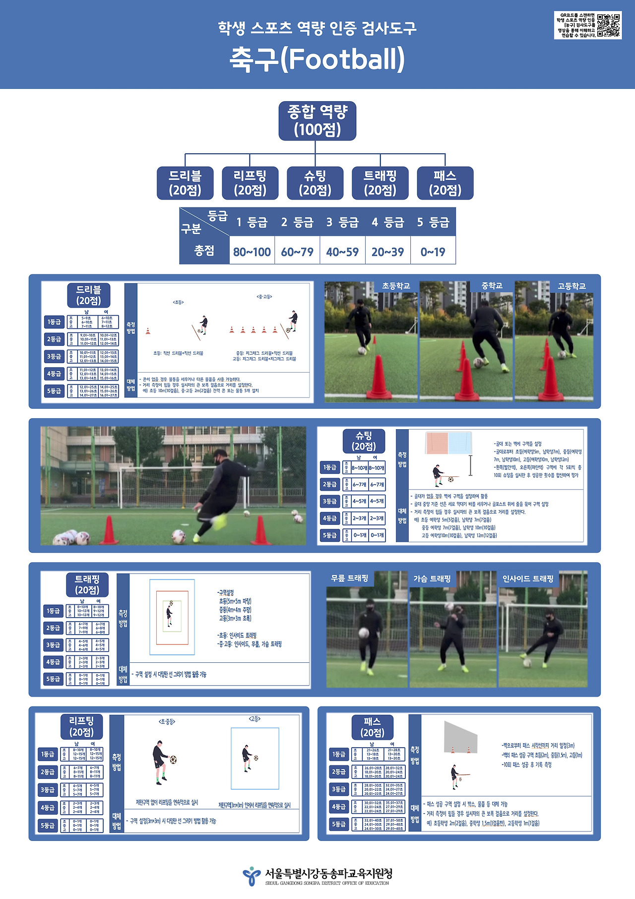 그럼에도 불구하고, AAHPERD가 다양한 스포츠기능검사를 개발하고 보급했던 것처럼 양질의 스포츠 역량 검사 도구의 필요성은 분명하다. 모든 체육 교사들에게 필요한 것은 아닐지 몰라도, 어떤 교사와 어떤 학생에게는 꼭 필요한 부분일 수도 있다. 특히나, 코로나 시국에서 학생이 혼자서 연습하는 것만으로도 해당 스포츠의 재미를 느끼고 경기력을 향상시킬 수 있는 방법이 있다면 좋겠다는 의견도 분명히 존재하고 있었다. 그래서, 관내 체육 교사들이 전문성을 발휘하여 학교 체육 현장에서 가장 많이 하고 있는 주요 종목 '농구·배구·축구'의 검사도구를 개발했었다. 교사와 학생들이 이해하기 쉽게 영상으로 자료를 만들고, 학교에서 활용하기 쉽게 포스터 형식의 자료와 매뉴얼을 함께 관내 초중고에 보급했었다. 그 시기와 방법에서 널리 활용되지 못하여 아쉬움은 남았지만, 이 과정에 참여한 교사들의 전문성 함양과 교육청의 경험적 지식 축적 등에서 의미있는 시간이었다고 생각한다. 늦었지만, 지금이라도 이 자료들이 널리 활용되었으면 하는 마음으로 그 내용을 여기에 공유해 본다.