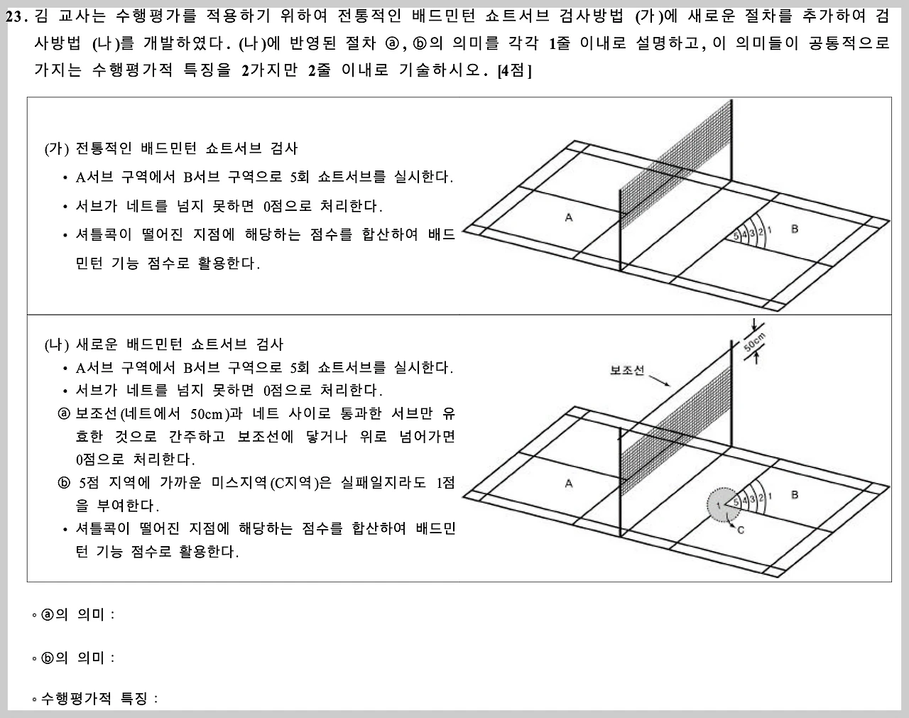 학교체육의 개념이 단순한 '체력의 증진'을 넘어 '신체활동 문화를 향유하는 것'을 지향하는 시대에, 체육 교과 국가교육과정에서도 '스포츠'가 가장 큰 비중을 차지하고 있는 시대가 되었다. 체육 교육에 몸담고 있는 사람으로서 '스포츠 역량'은 무엇이며, 이를 어떻게 확인할 수 있을지에 대한 고민과 궁금증은 당연한 것이라고 생각한다(물론, 내가 학교체육 담당 장학사라서 그런 것일지라도 말이다.). 체육 교사 시절부터 평가 도구를 설계하고 기준을 설정하는 과정은 내가 가장 좋아했던 일이다. 체육 교사로서의 정체성과 전문성이 가장 크게 발휘되는 순간이 바로 이 과정이라고도 생각한다. 가장 즐겁지만 가장 어려운 평가도구 설계의 과정, 교사라면 이 과정을 가장 사랑해야 한다고 생각했었다. 그리고 아래의 임용고사 문항 사례처럼 이러한 부분들은 교사 선발 과정에서도 실제로 강조되어 왔고, 현직 교사를 대상으로 하는 직무연수 등에서도 가장 중요한 부분이라고 생각한다.
