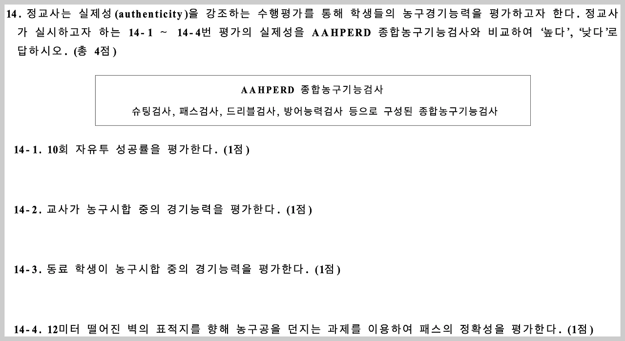사실 내가 AAHPERD라는 이름을 기억하게 된 계기는, 내가 응시했었던 2003학년도 중등 체육 교사 임용시험에 출제되었던 문항을 통해서였다. 당시에 내가 이 문제의 정답을 맞게 썼었는지는 기억나지 않지만, 어떤 조직인지 몰라도 '권위있는 종합농구기능검사'가 존재하는가보다라는 생각을 했던 기억은 뚜렸하게 남아있다. 위에서 이야기를 풀면서 사례로 제시했던 중등 체육 교사 임용시험 문제도 그랬지만, 우리나라 교사 임용 시험이 문제의 질이 정말 좋고 실제 교사 생활을 하면서도 중요한 부분이 무엇인지를 잘 제시해주는 것이 아닌가 싶다.