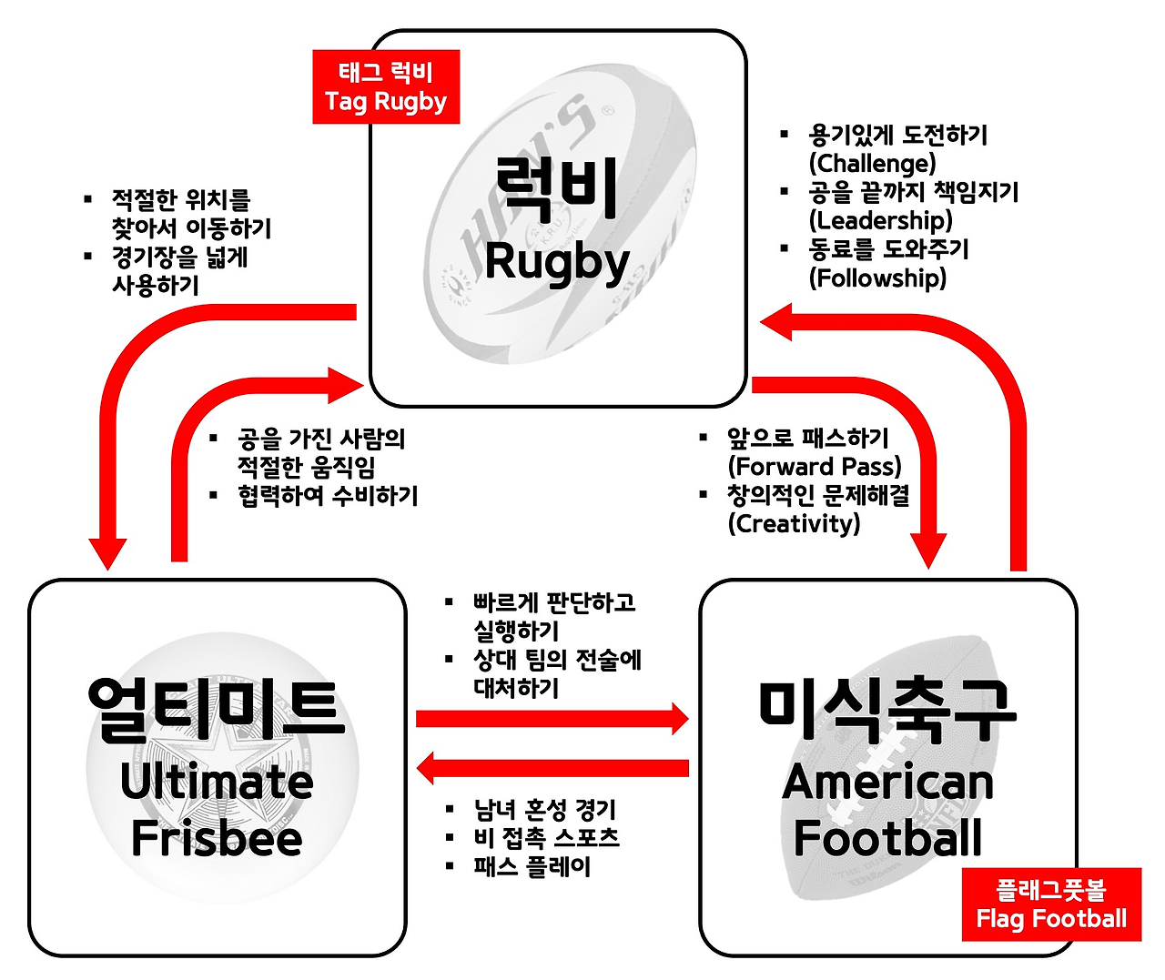 현재의 중학생을 기준으로 생각해보면, 대부분의 학생이 초등학교 때 이미 얼티미트 경기를 학습한 것으로 느껴진다. 즉, 럭비나 미식축구의 기본적인 경기방법을 학습하는 과정은 과거보다 훨씬 쉬워진 상황이다. 얼티미트 프리스비에서 몇 가지 규칙을 추가하는 방식으로 학습하면, 대부분의 학생이 럭비와 미식축구를 쉽게 이해할 수 있는 환경이 된 것이다. 예전에는 이것이 불가능했기 때문에 ‘얼티미트-태그럭비-플래그풋볼’을 모두 처음부터 지도했던 기억이 있다. 태그럭비나 플래그풋볼이 활성화될 수 있는 기반이 마련되어 있다는 측면에서 과거보다는 훨씬 나은 환경이 되었다.