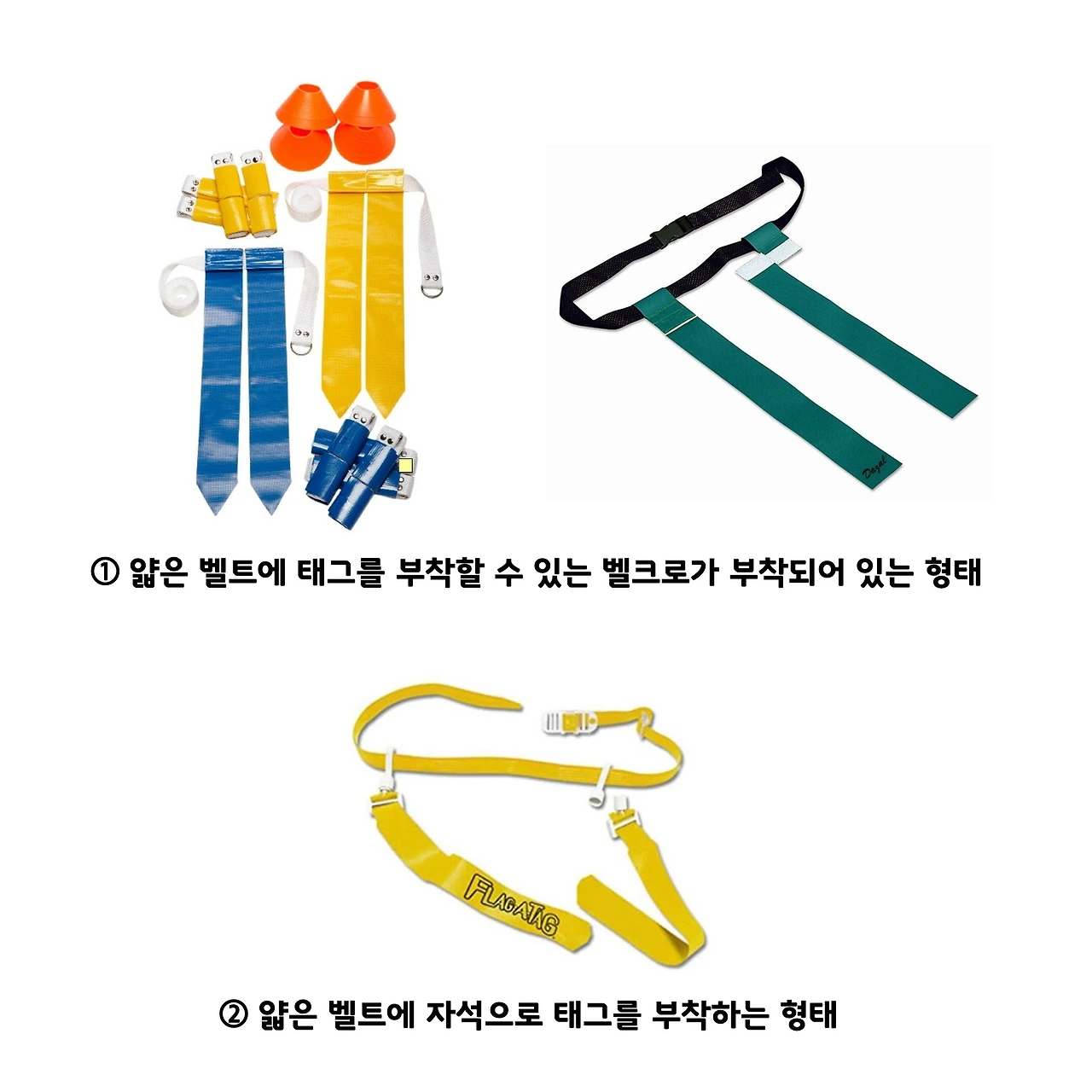 시중에서 일반적으로 구할 수 있는 태그 벨트는 크게 세 가지 형태로 구분할 수 있다. 첫째, 다음 그림 중 ① 형식의 태그 벨트다. 얇은 줄로 만들어진 벨트에 태그를 부착할 수 있는 벨크로 테잎 부착 부분이 작게 첨부되는 형식이다. 태그를 부착하기 위해서는 벨트를 착용한 후에 태그를 부착할 위치로 벨크로 테잎의 부착지점을 이동시켜야 한다. 둘째, 다음 그림 중 ② 형식의 태그 벨트다. ① 형식과 동일한 형태지만, 벨크로 방식이 아닌 자석 등으로 태그를 부착하는 형식이다. 공식적인 플래그풋볼 경기에 많이 사용된다. 셋째, 다음 그림 중 ③ 형식의 태그 벨트다. 벨트 자체가 양면 벨크로 테잎으로 만들어진 형식으로, 벨트를 허리에 둘러 벨크로를 붙여 고정한 후에 태그를 부착하면 된다.