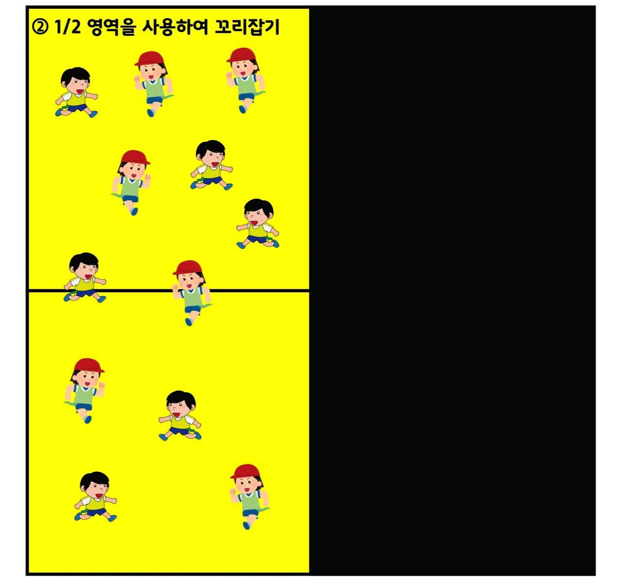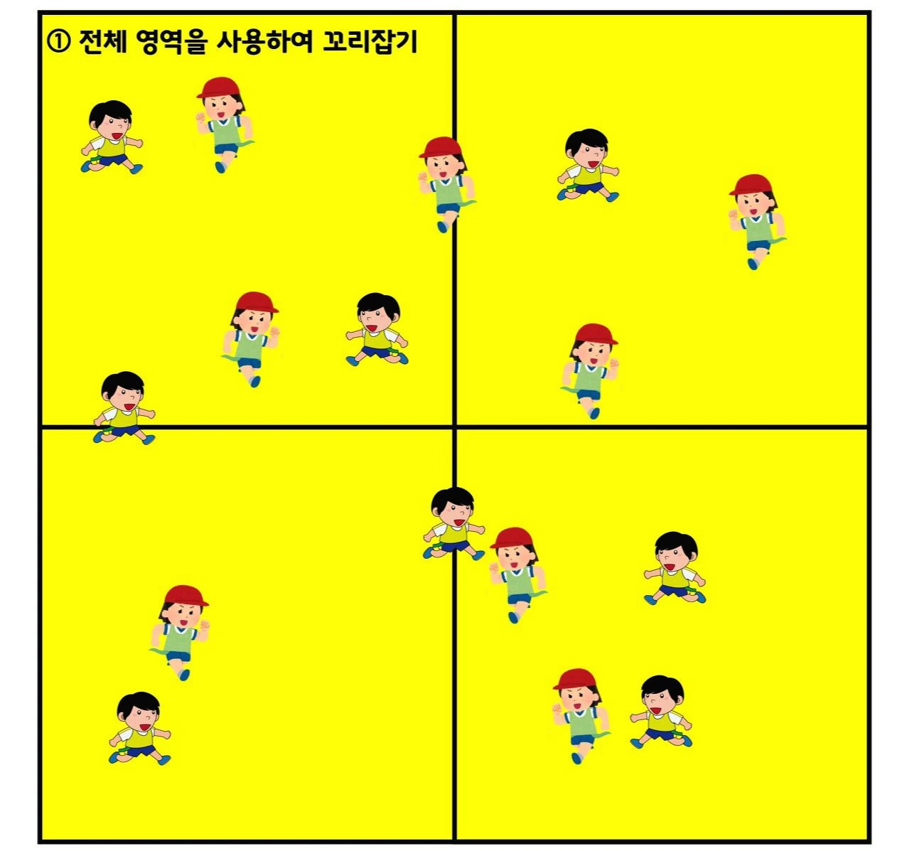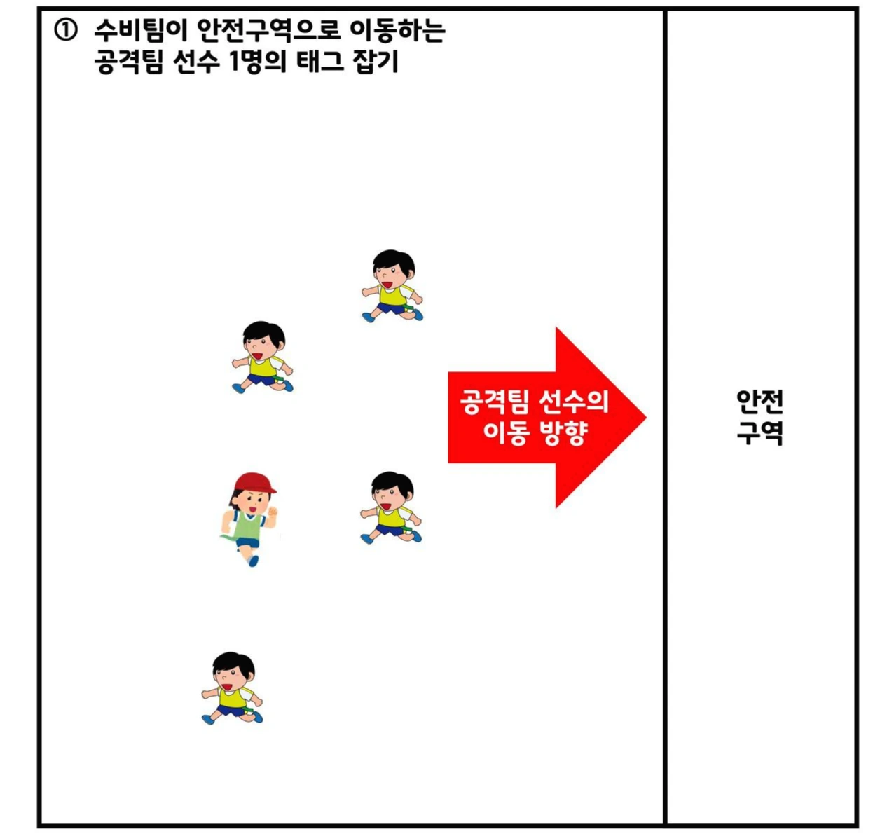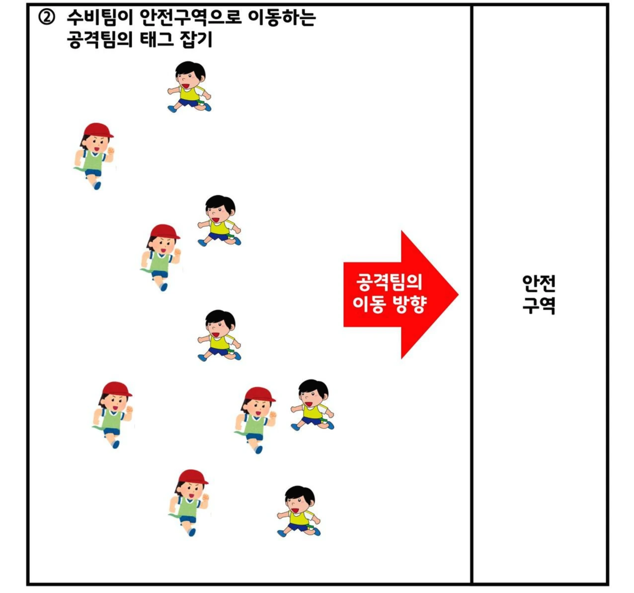 개인적인 움직임을 학습한 이후에는 공격팀과 수비팀을 나누어 경기의 기본적인 구조를 학습하는 단계로 넘어가게 된다. 내 경우에는 일반적으로 두 단계로 진행을 했었다. 먼저, 공격팀이 한 명씩 순서대로 안전 구역을 향해 이동하면 수비팀이 공격팀 선수의 태그를 잡기 위해 협력하며 막아내는 게임이다. 이를 통하여 한 명의 움직임을 막기 위하여 협력하는 수비의 기본적인 형태를 학습할 수 있다. 다음 단계는, 공격팀의 모든 선수가 동시 다발적으로 안전 구역을 향해 이동하고 수비팀이 이것을 막아내는 게임이다. 순식간에 벌어지는 정신없는 혼란 속에서 모든 선수가 빠르게 판단하고 실행하는 과정을 학습할 수 있다.