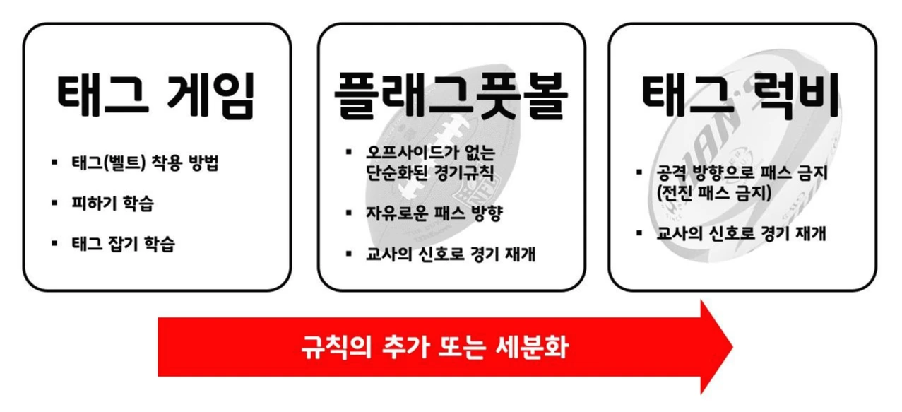 태그 게임의 다음 단계는 본격적으로 공을 이용한 경기를 하는 것이다. 내 경우에는 경기규칙을 단순화한 플래그풋볼을 먼저 지도한 후, 태그럭비로 넘어갔었다. 플래그풋볼은 경기장 라인부터 규칙까지 세부적인 내용이 너무 많기 때문에 체육 수업 안에서 할 때에는 규칙을 단순화할 필요가 있었다. 플래그풋볼 규칙을 최대한 단순화 했더니 태그 럭비에서 앞으로 패스하는 것만 허용하는 경기가 되었다. 이렇게 단순화한 플래그풋볼 경기를 먼저 경험한 후에, 전방 패스가 금지된 규칙의 태그럭비로 넘어가니 자연스럽게 연계가 이루질 수 있었다. 두 경기를 모두 경험한 이후에는 언제든지 하나를 선택하여 즐길 수 있게 되어 수업이 더욱 풍성해졌던 기억이 있다. 리드업 게임의 구성원리를 활용하여 규칙을 단순화함으로써 두 종목 모두 학습이 가능했던 것이다. 전적으로 개인적 경험을 바탕으로 하는 이야기에 불과하겠지만, 태그 럭비나 플래그 풋볼 수업을 준비하는 선생님이 계시다면 참고하셨으면 한다.