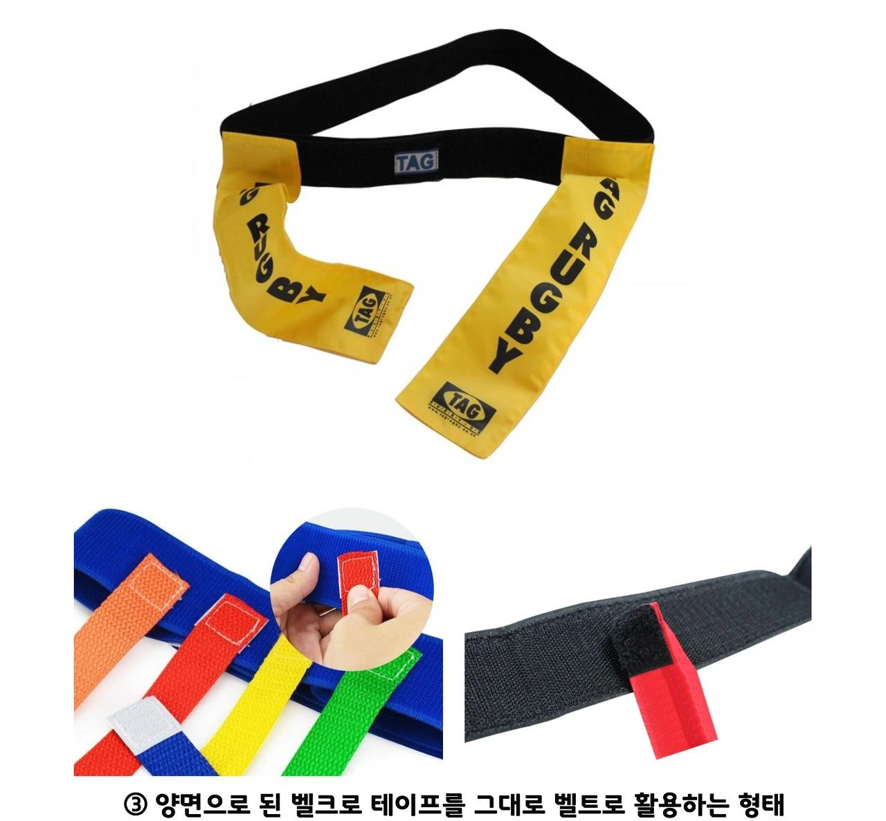 이런 문제를 해결하기 위해, 해외의 사례들을 살펴보았다. 열심히 다양한 제품을 검색해보니 ③번과 같은 형식의 양면 벨크로 테이프를 태그 벨트로 활용한 형태가 많다는 것을 알 수 있었다. 하지만, 아무리 찾아봐도 우리나라에 유통되는 제품은 없었다. 고민해보니 양면 벨크로 테이프를 잘라서 사용하면 될 것 같았다. 검색해보니 다양한 폭과 길이의 양면 벨크로테이프가 유통되고 있는 것을 확인 할 수 있었다. 폭 4~5cm 정도 되는 양면 벨크로 테이프를 50m정도 구입하여, 1.2m 정도로 자르니 태그를 부착할 수 있는 벨트로 손색이 없었다. 이 벨트를 사용한 이후에는 학생들의 벨트 착용과 관련하여 신경 쓸 필요가 없어서 수업에 집중하는 것이 가능했다. 태그 럭비, 플래그 풋볼 등의 수업을 계획하고 있는 체육 교사가 있다면 ③번 형식의 태그 벨트를 준비하기를 강력하게 추천드리고 싶다. 혹시, 이 글을 럭비협회나 미식축구협회에서 우연히라도 보신다면 종목의 활성화를 위한 장비 개발 및 보급에 참고해 주셨으면 하는 마음이다.