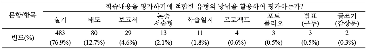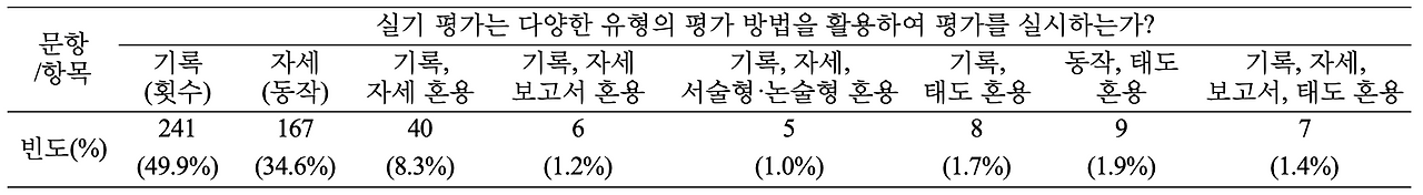 평가 방식은 편중되어 있지 않을까. 한 때는 체육 교과 역시 인지적/심동적/정의적 영역으로 학습목표를 구분하며, 심동적 영역 즉 신체활동 중심의 실기평가 비중을 70%로 명확하게 제시하기도 했었다. 아무래도 이 때의 지침이 지금까지 학교 체육 수업에 지배적인 영향력을 미치고 있는 것으로 이해가 되는 부분이다. 오히려 눈에 들어오는 부분은 연구 대상의 30% 정도되는 학교가 아예 심동적 영역의 평가만 하고 있다는 것이다. 이 경우는 과거의 교육과정 기준과 관련 지침에 비추어봐도 바람직한 사례로 이해하기는 어렵다.